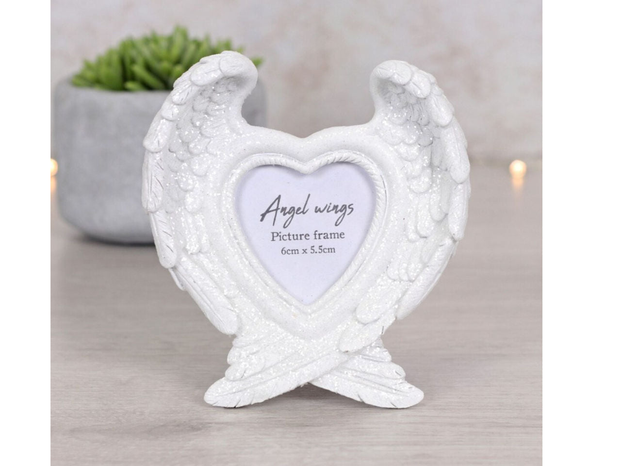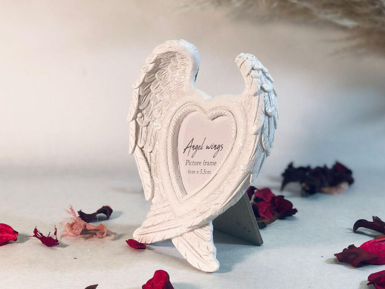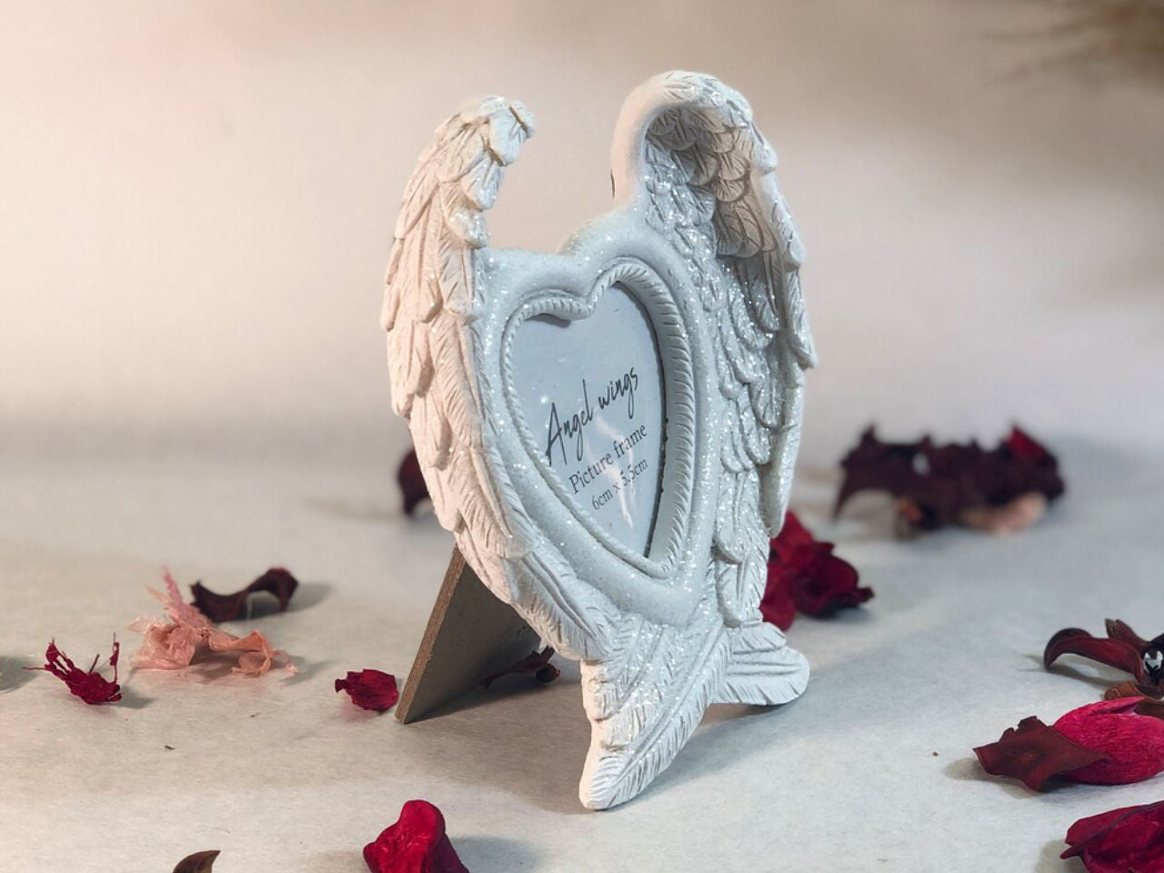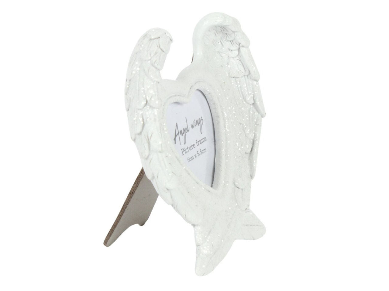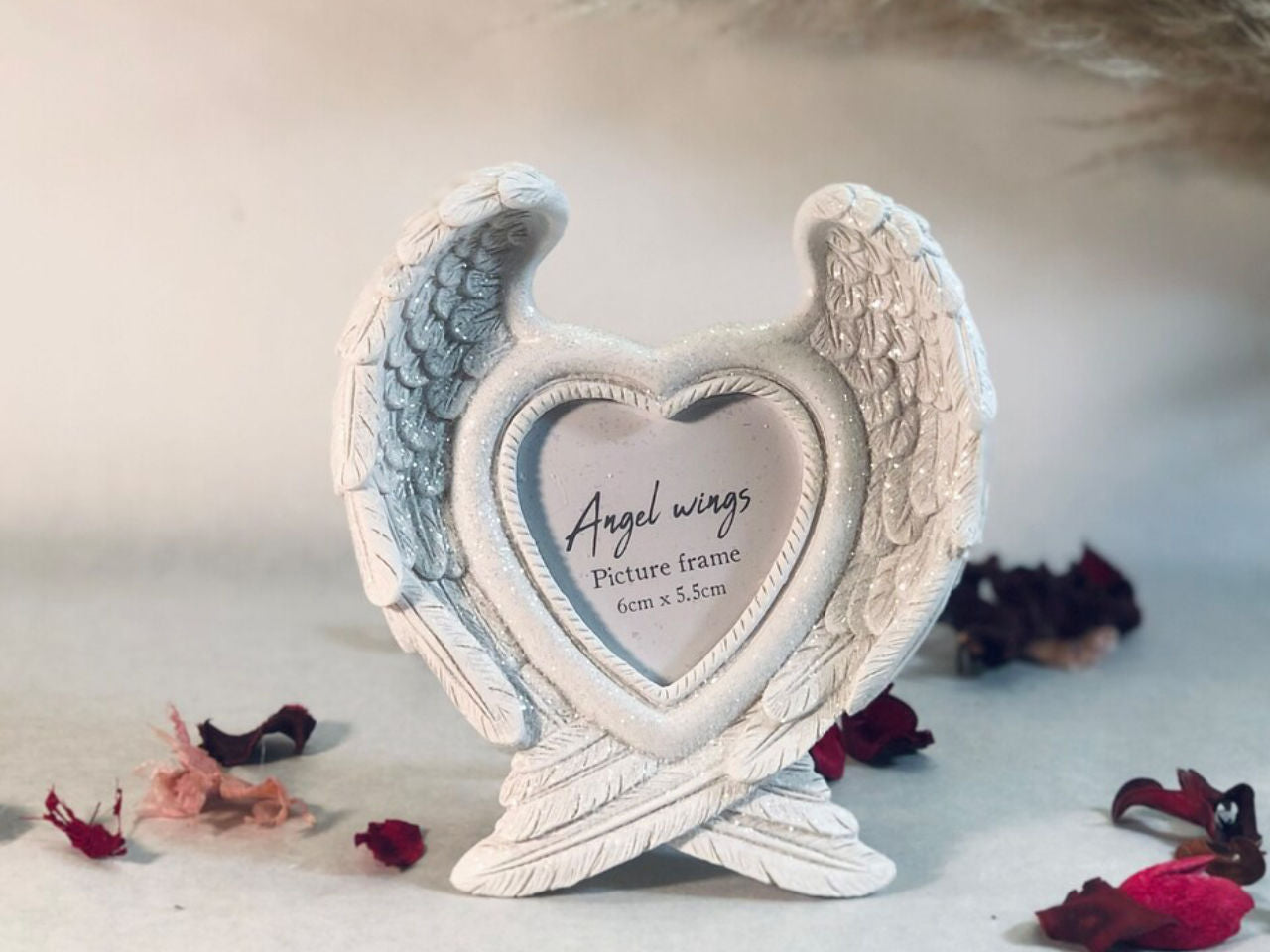 The frame has a clear glitter finish which looks beautiful when caught in the light. The glitter on these angel wings beautifully reflect light and glitter and glow around the photo within. This frame really is an extremely beautiful way to treasure wonderful memories or remember lost loved ones. It's a very pretty frame and suits any home decor too.