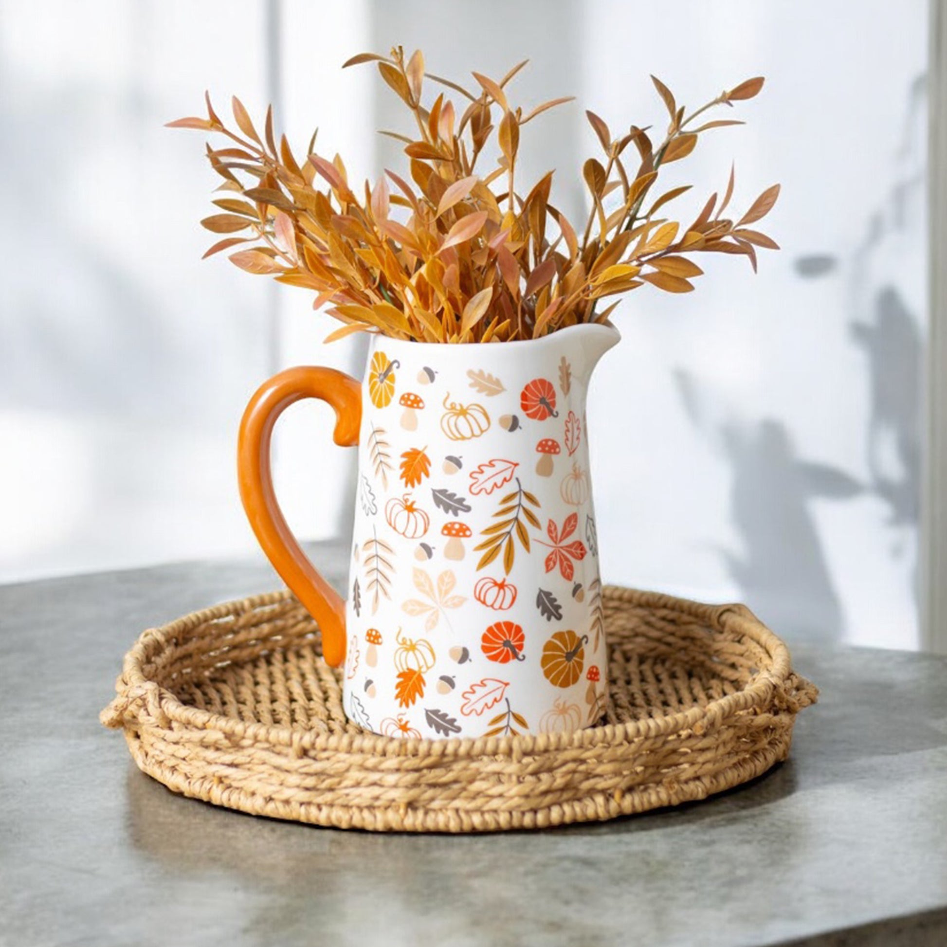 Welcome the Autumn season to your home with our autumnal flower vase jug, which has falling autumn leaves, pumpkins and acorns on it. This flower jug can be used to spruce up end tables or mantelpieces, with either dried or fresh flowers inside the vase.