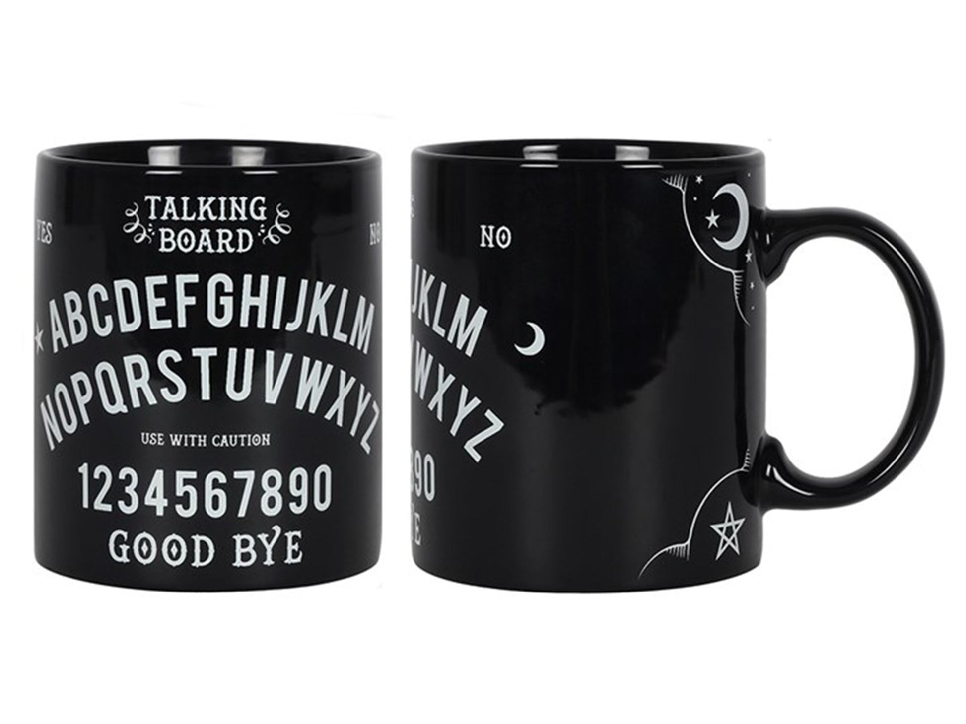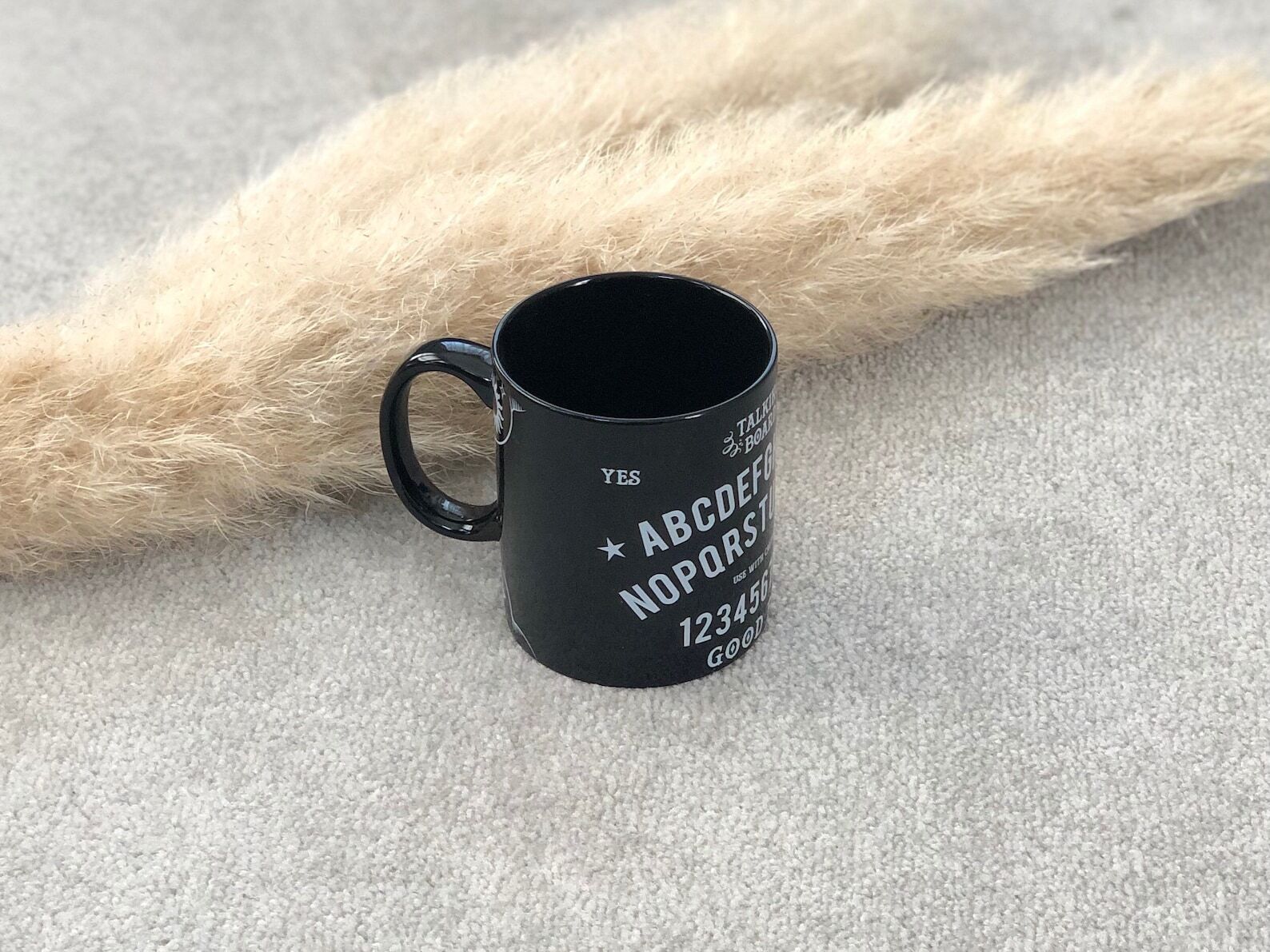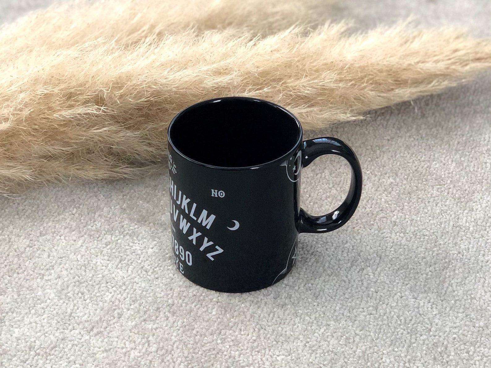Black new bone china mug with white text, featuring a talking board / ouija board design in white text. This talking board mug makes the perfect gift for all lovers of witchy gifts, black magic and the occult. These black coffee mugs and tea cups are standard sized and come in a lovely gift box so they make a wonderful gift! The mugs feature the alphabet in the layout of a ouija board along with the words 'talking board' and 'yes' and 'no'. The mug also features the words 'goodbye' and 'use with caution' to add to the creepy mystique of this special coffee and tea mug. The mug comes with a handle for easy holding and features wonderful motifs around the handle such as a pentagram star and a decorative moon and star, as well as a beautiful ornate sun.