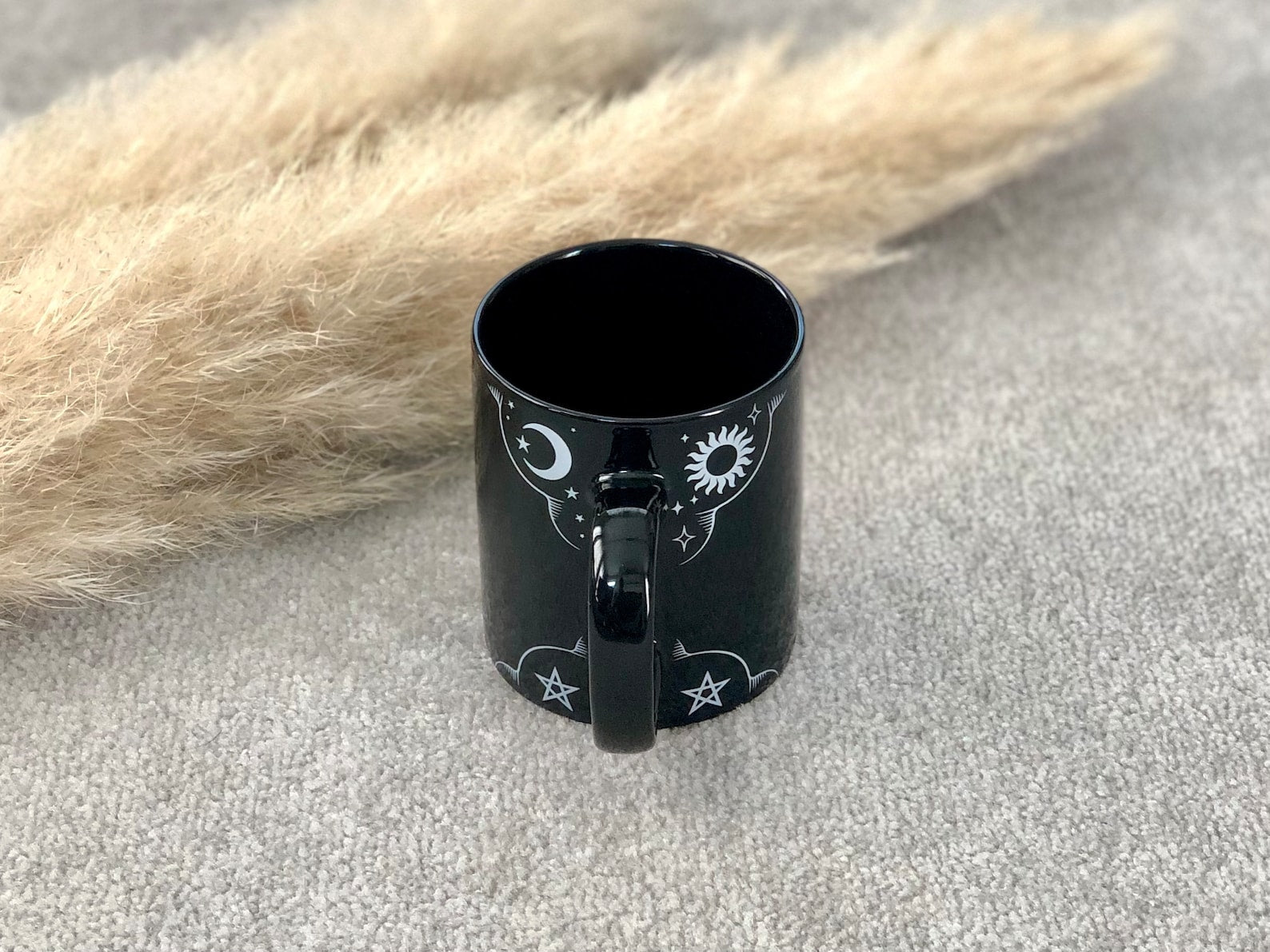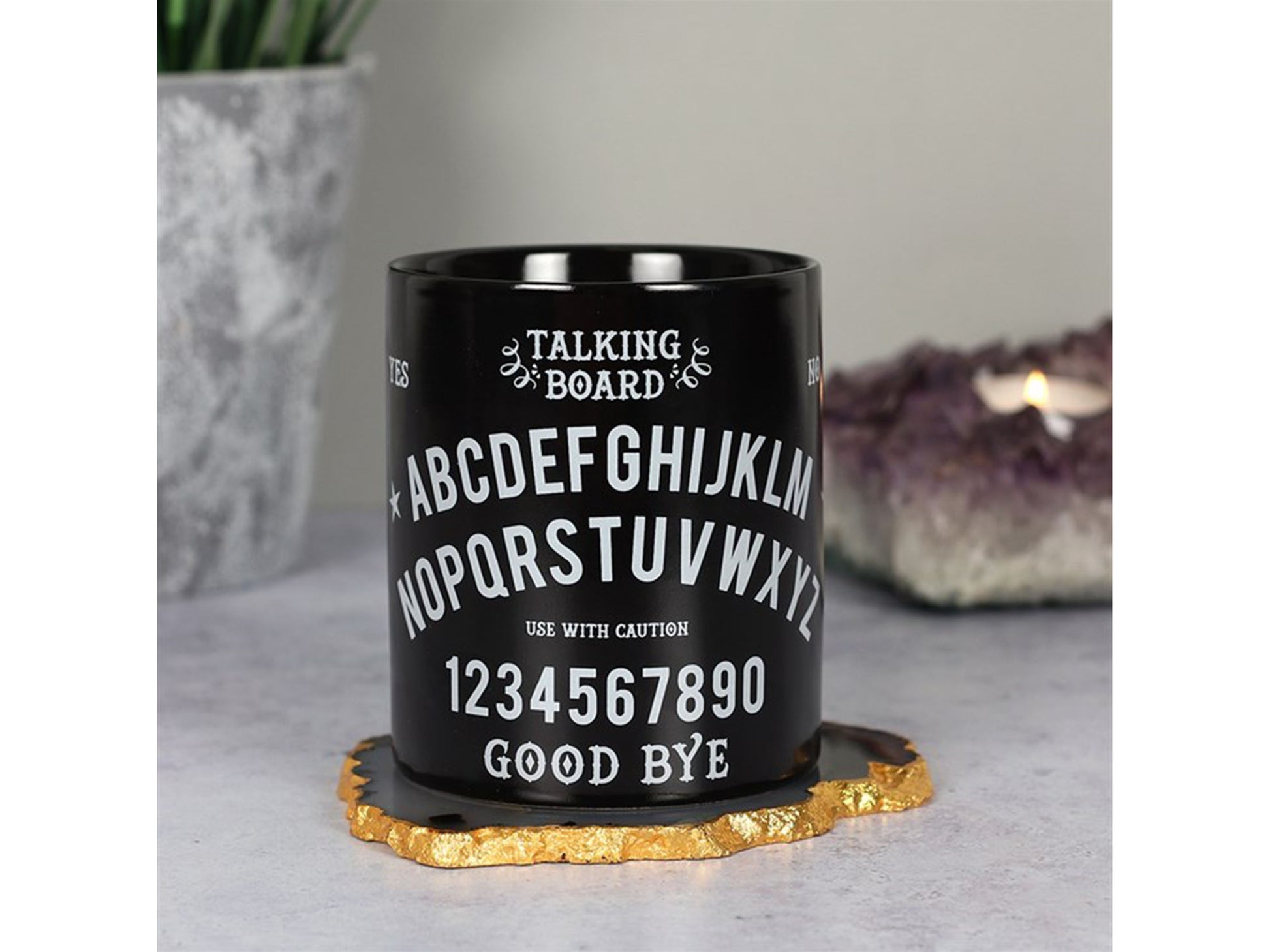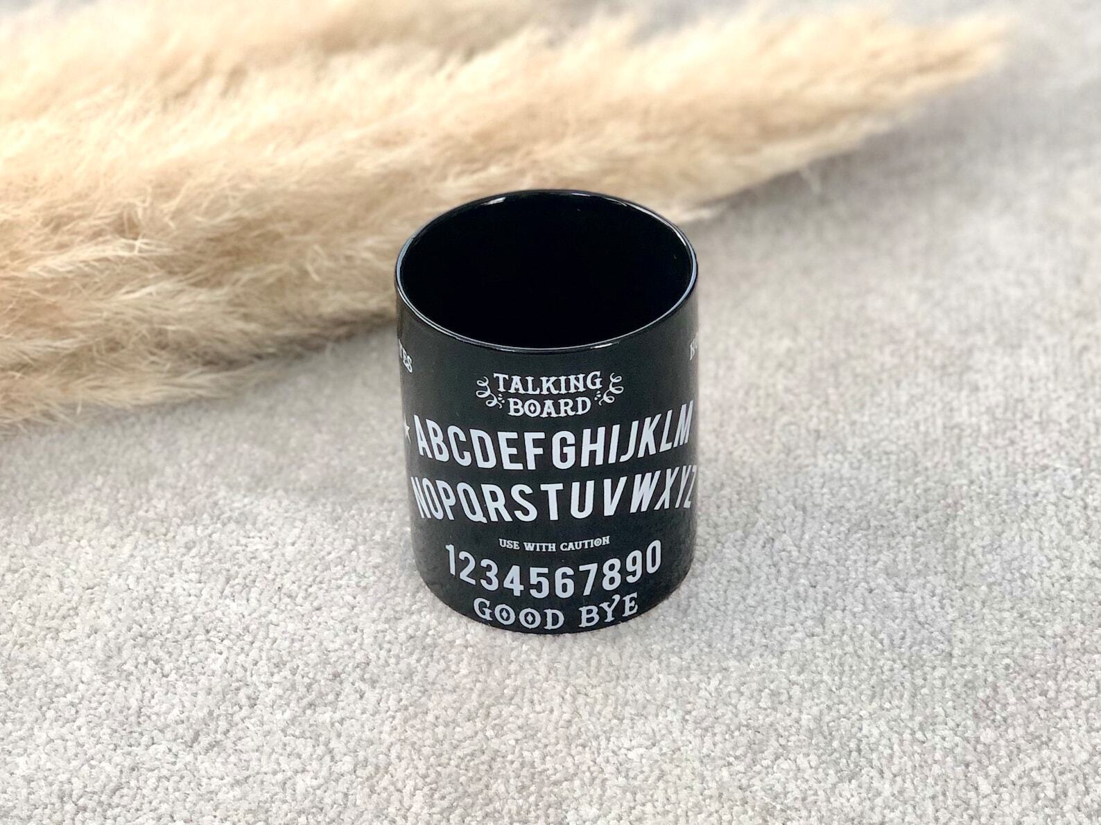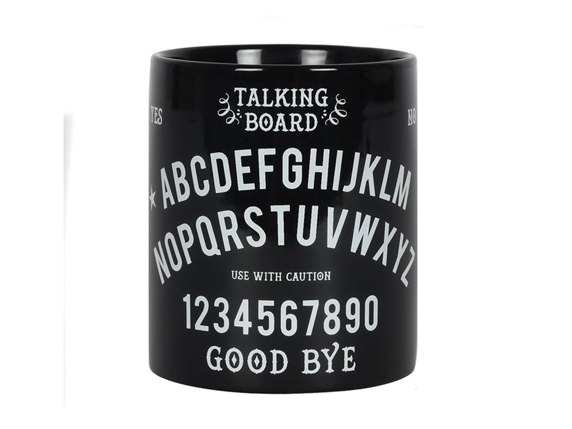 Black new bone china mug with white text, featuring a talking board / ouija board design in white text. This talking board mug makes the perfect gift for all lovers of witchy gifts, black magic and the occult. These black coffee mugs and tea cups are standard sized and come in a lovely gift box so they make a wonderful gift! The mugs feature the alphabet in the layout of a ouija board along with the words 'talking board' and 'yes' and 'no'. The mug also features the words 'goodbye' and 'use with caution' to add to the creepy mystique of this special coffee and tea mug. The mug comes with a handle for easy holding and features wonderful motifs around the handle such as a pentagram star and a decorative moon and star, as well as a beautiful ornate sun.