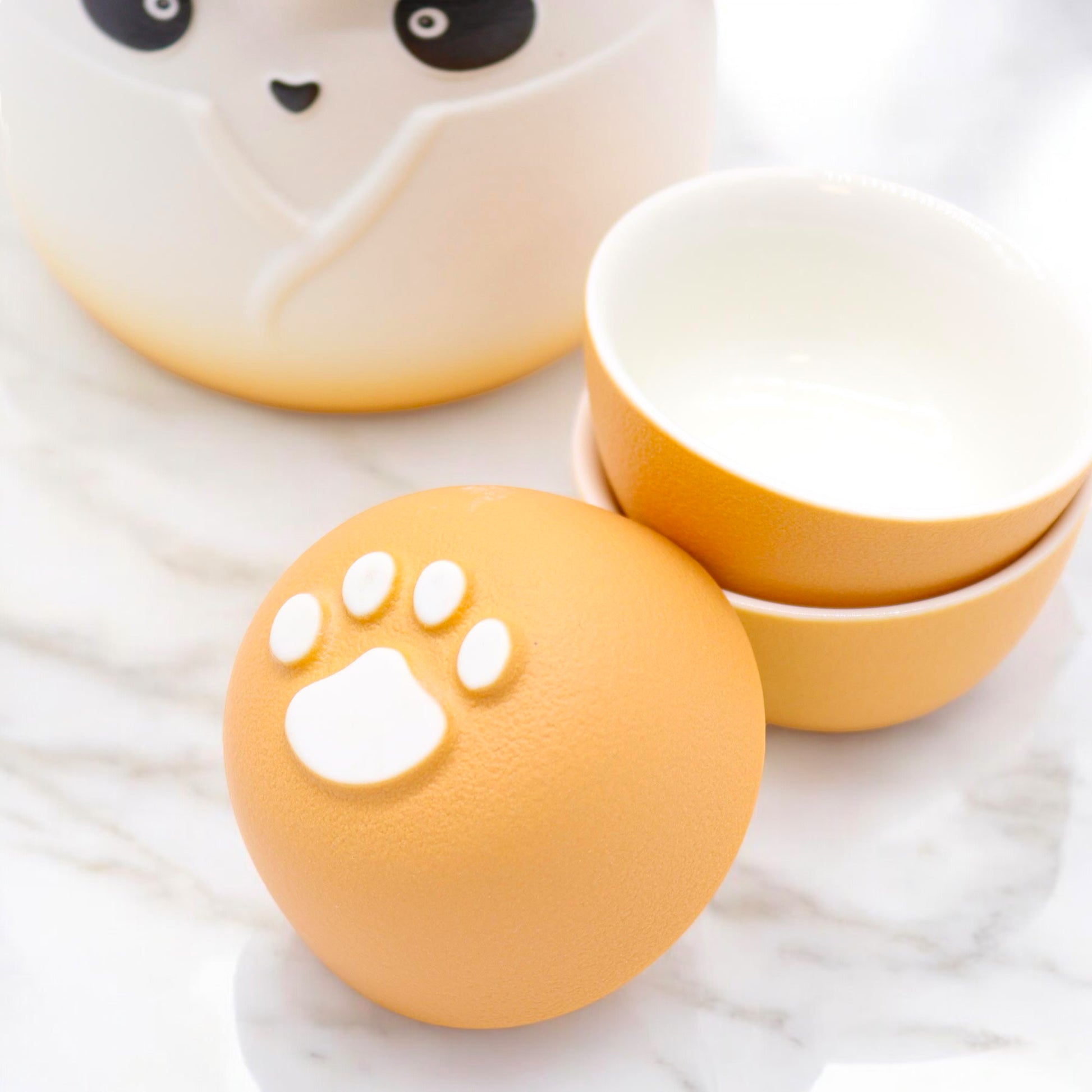 Each set includes a teapot with a built-in diffusion chamber for loose leaf teas, along with two matching tea cups, each with paws adorning the bottom for a fun, functional design.