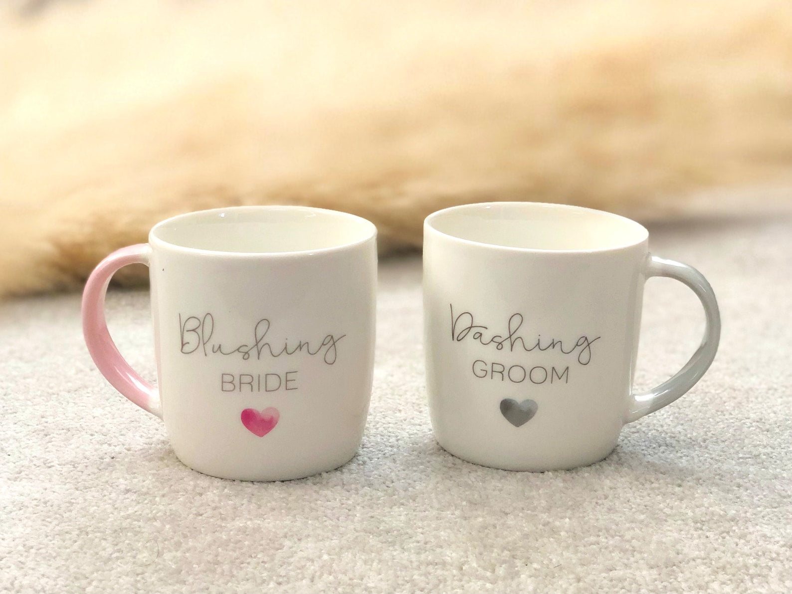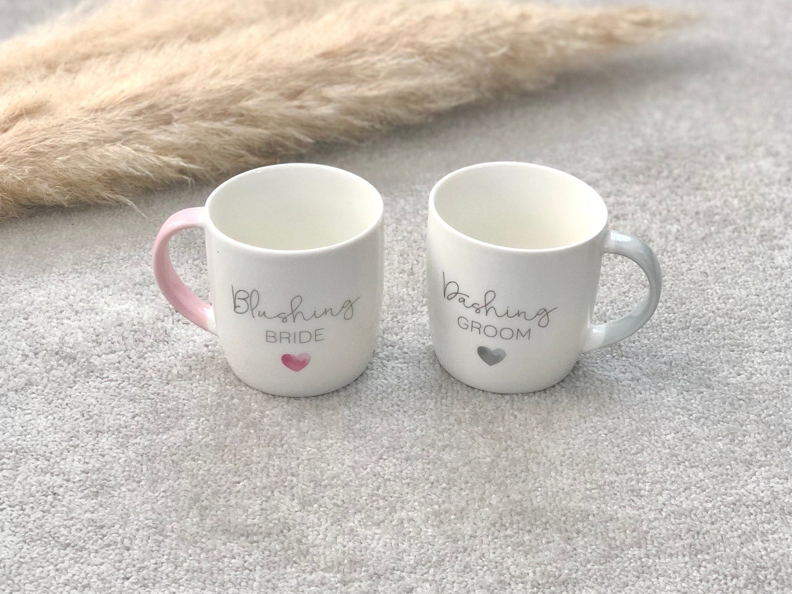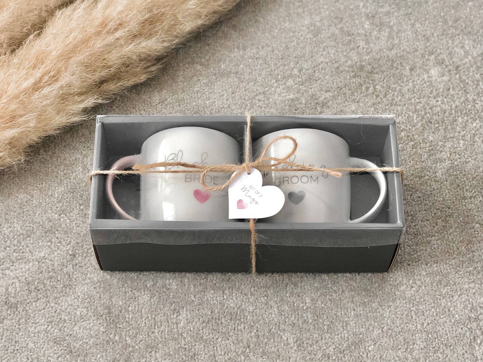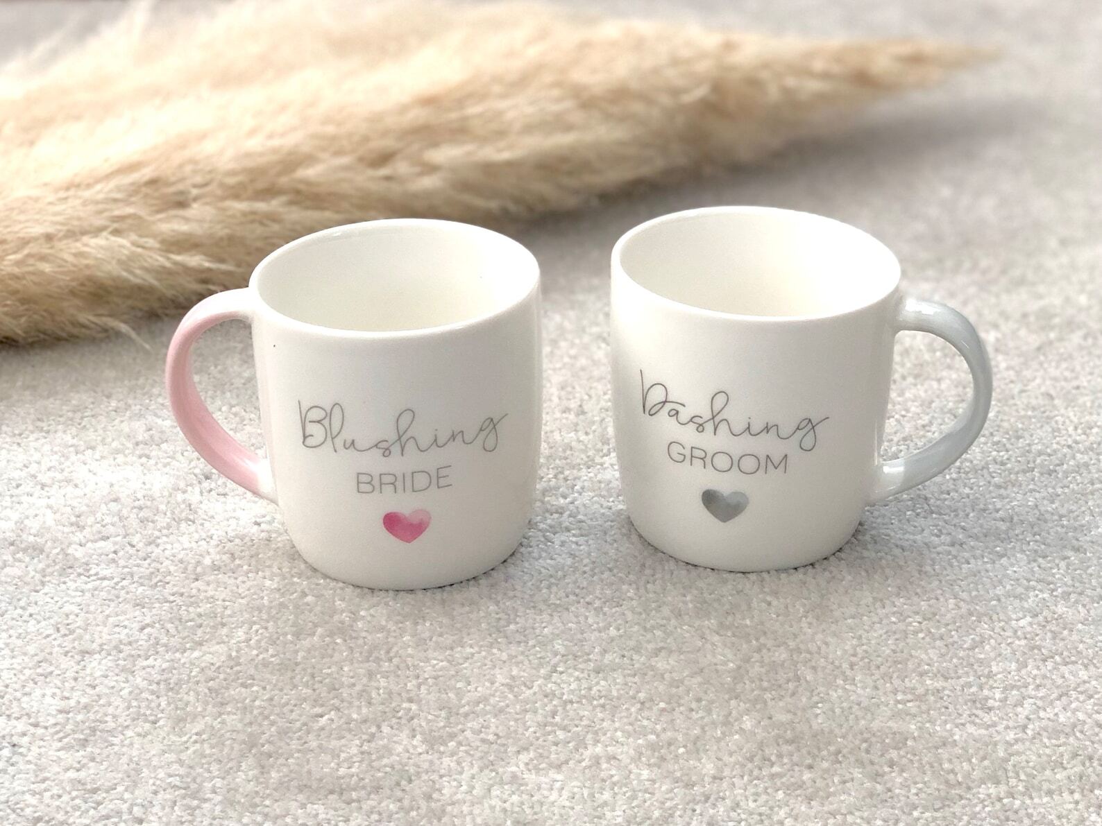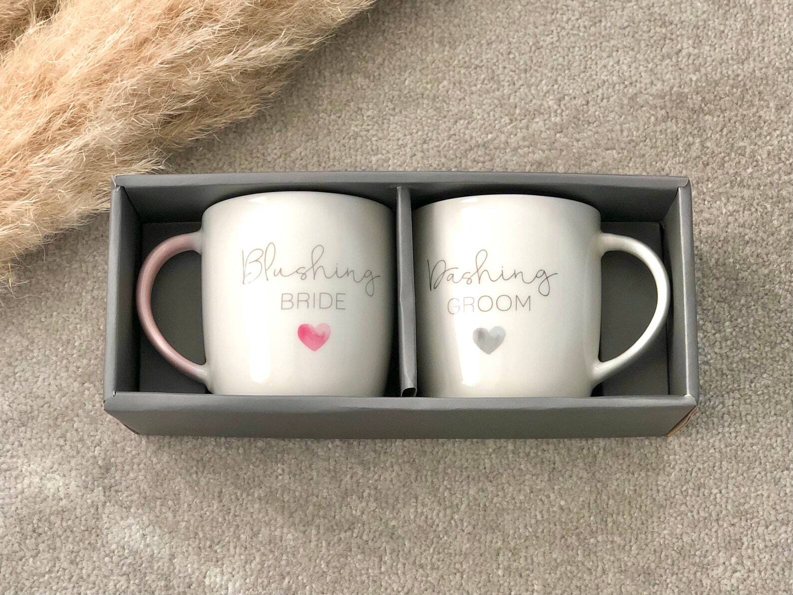 White ceramic mug set for a couple mug who are getting married or have recently been married or engaged, these two mugs make a wonderful gift set. This pair of white ceramic tea & coffee mugs/cups with 'blushing bride' and 'dashing groom' on them are such a lovely gift. They are really wonderful Valentines, Engagement, Anniversary and Wedding gifts! They are a really thoughtful gift and are great to gift for house warmings for newly engaged or married couples. One mug reads 'Dashing Groom' in a lovely grey colour and the other says 'Blushing Bride' in a wonderful dusky pastel pink; each mug has a heart on it in the same colour as the text and a coloured handle to match!