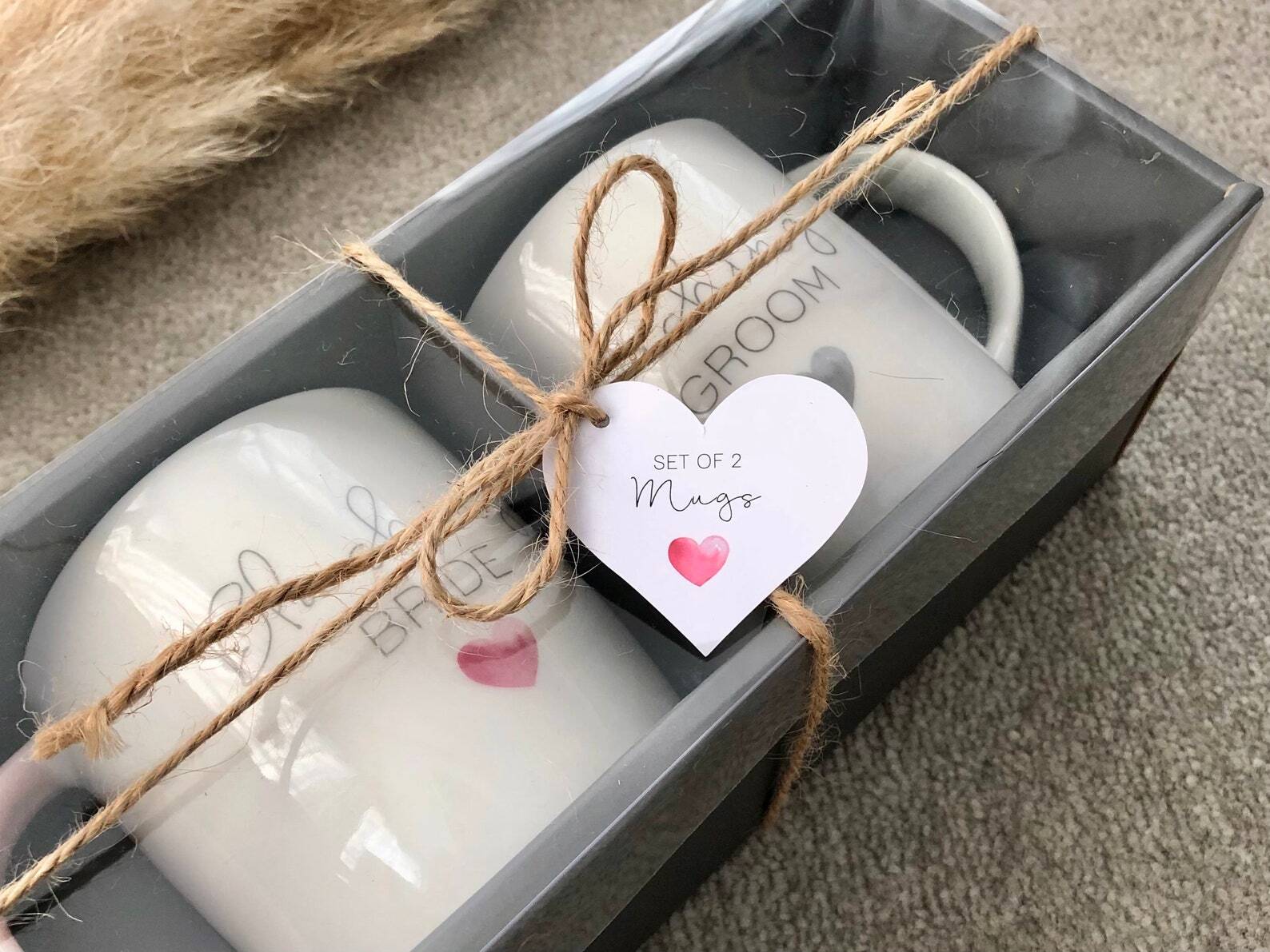 Set of two contemporary mugs that make a great gift for couples for Christmas, engagement parties, weddings or anniversaries. The mugs come presented in an attractive gift box with a plastic window and come finished tied with a lovely and rustic twine bow around them which makes these mugs a very pretty gift set.