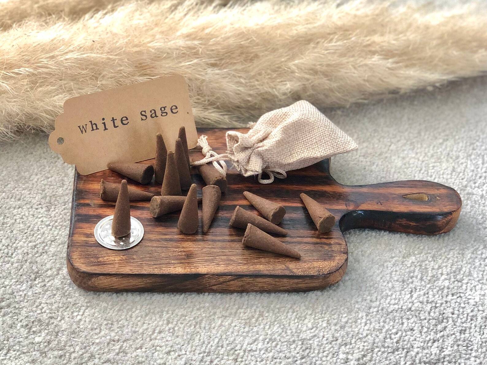 These gorgeous incense cones come in a lovely natural jute drawstring bag for safe keeping. You can buy the incense cones in sets of 5, 10 or 15 cones! The set of 15 incense cones will come with a small burner plate.
