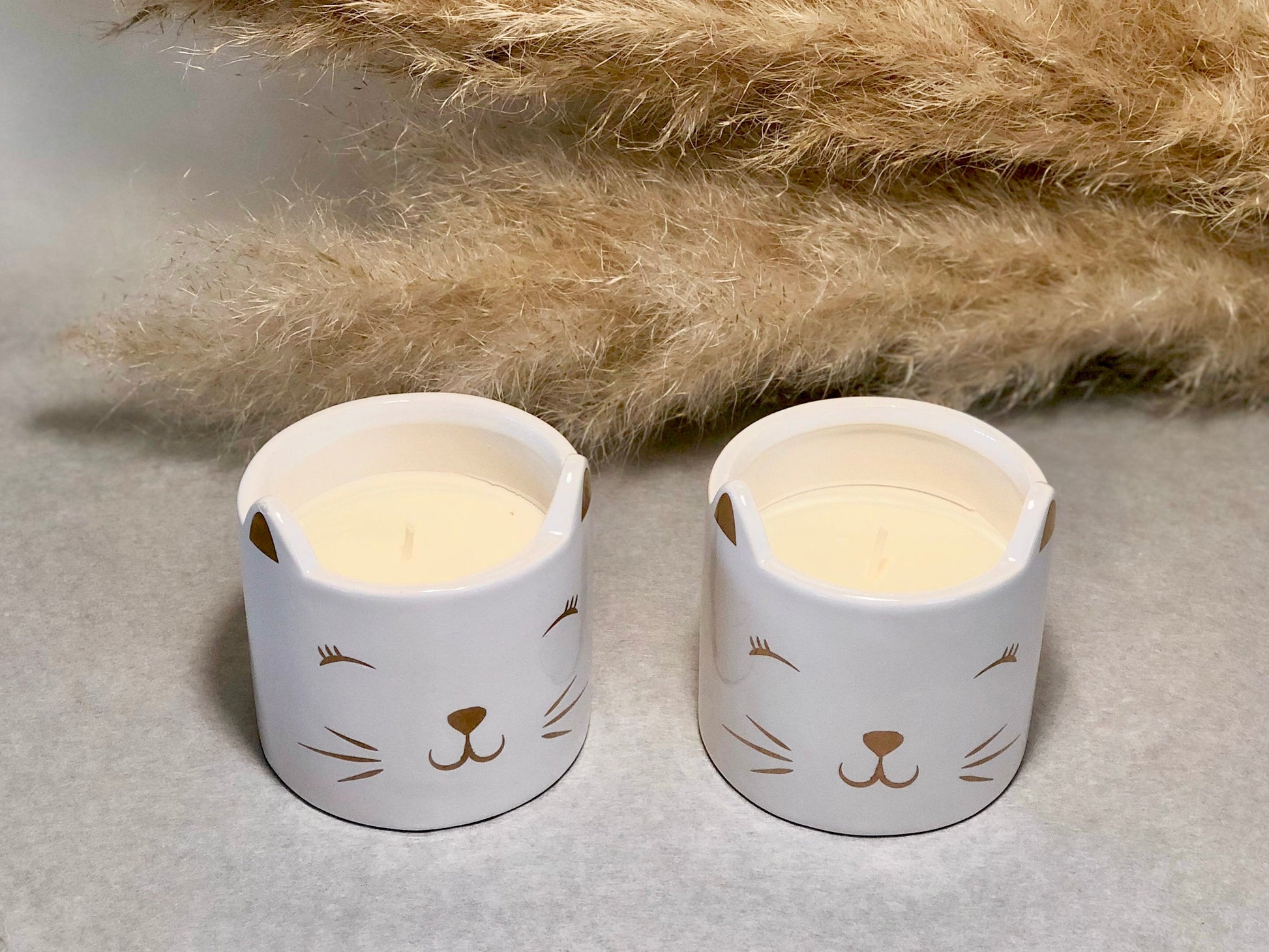 This adorable cat face candle has a very high quality, refreshing fresh linen scent that will make your home smell clean and fill it with a relaxing and calming atmosphere. The cat candle is set in a smooth white ceramic cat face shaped pot with really adorable cat ears on top and a cat face detailed with gold foil (making this a very pretty candle!)