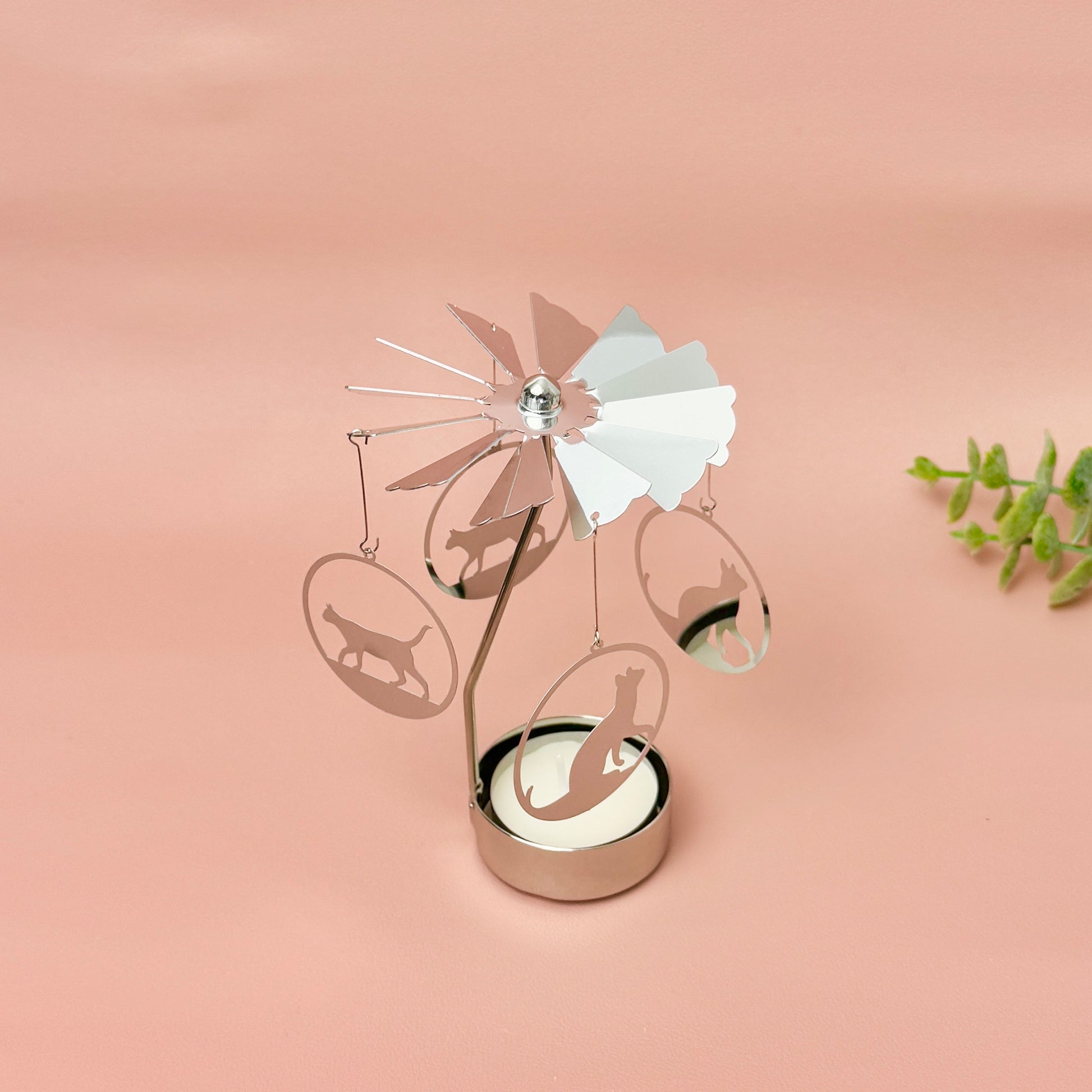 Our silver cat tealight carousel is a unique spinning candle holder and makes a perfect gift for cat lovers. Featuring four silver cats that gently rotate around the flame, this rotating tealight holder creates a warm glow when lit. The heat from the tealight powers the carousel, making the cats spin gracefully and casting beautiful reflections of light across the room.