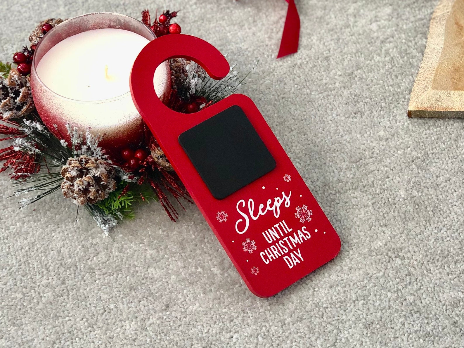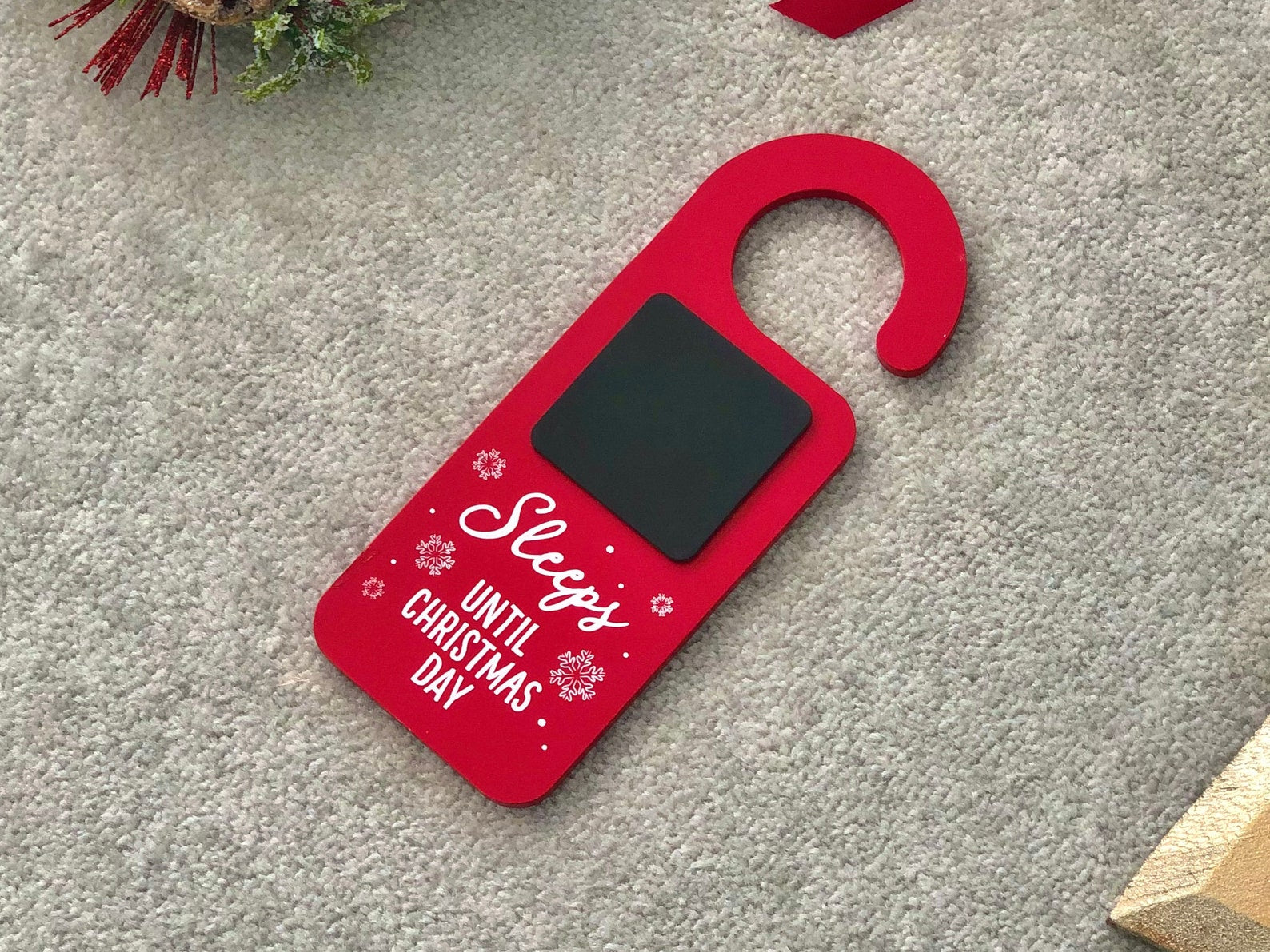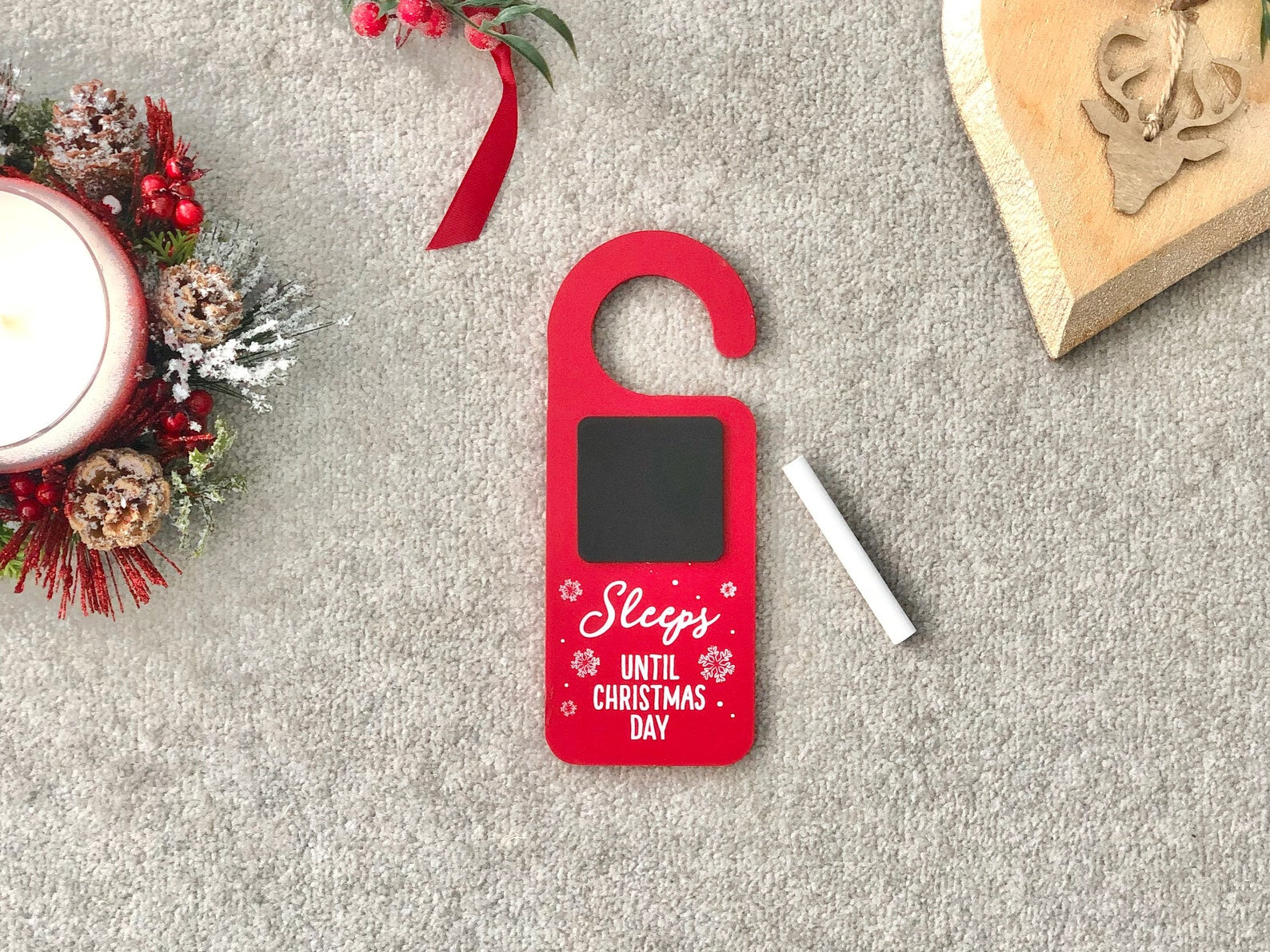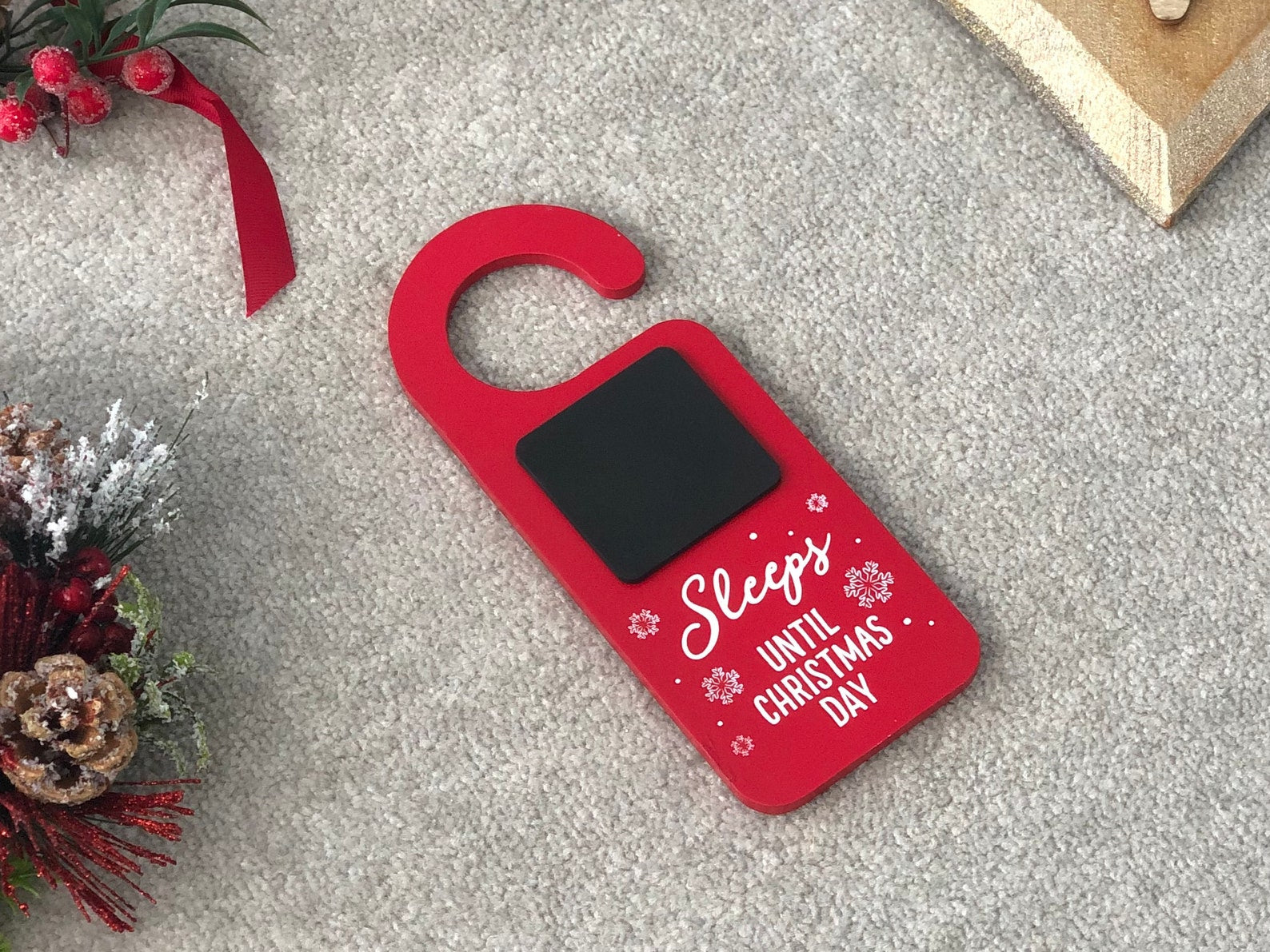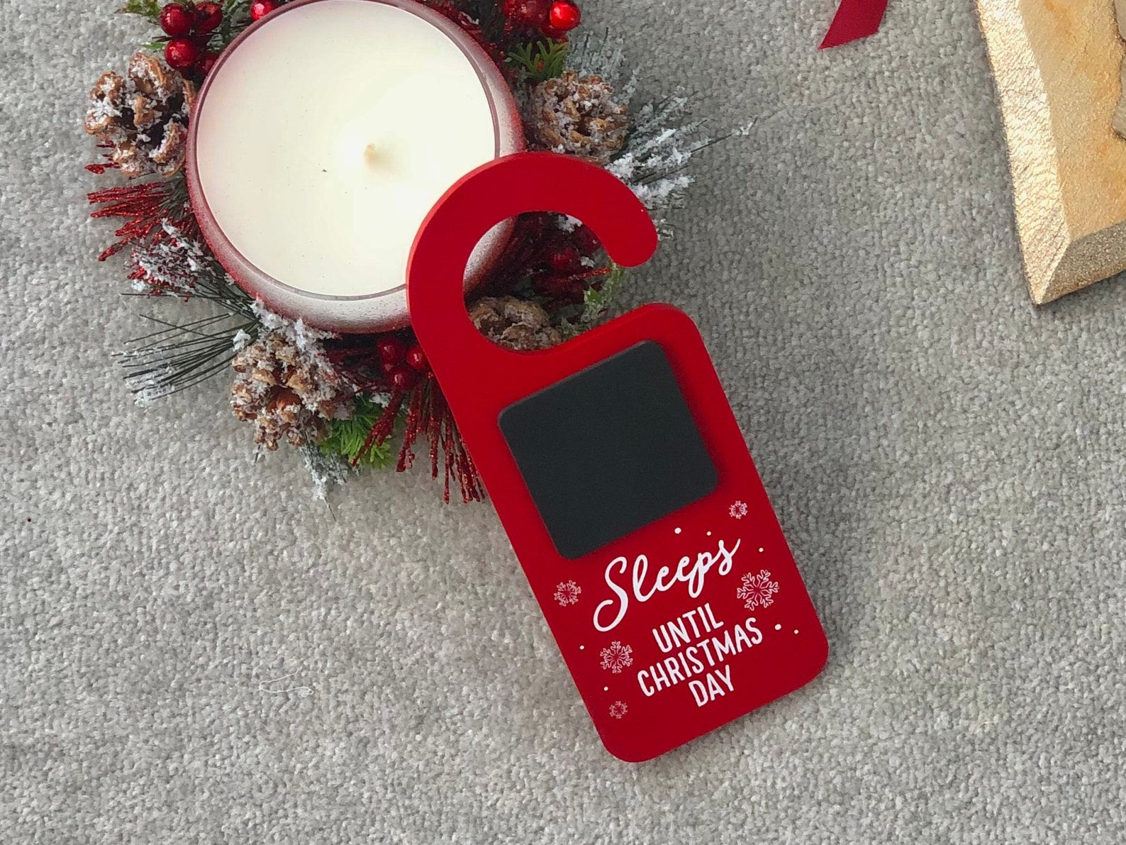 Red Christmas door hanger advent calendar with a wipeable chalkboard and a white snowflake design. This festive children's Christmas advent calendar / advent countdown will allow your children to write the number of sleeps left until Christmas each day and will build excitement as they get closer and closer to the big day! This door hanging Christmas countdown comes in a perfect Christmassy red with a black chalkboard for the kids to write the number of days on. It fits on any door handles and featured the words 'Sleeps until Christmas', as well as very pretty white snowflakes.