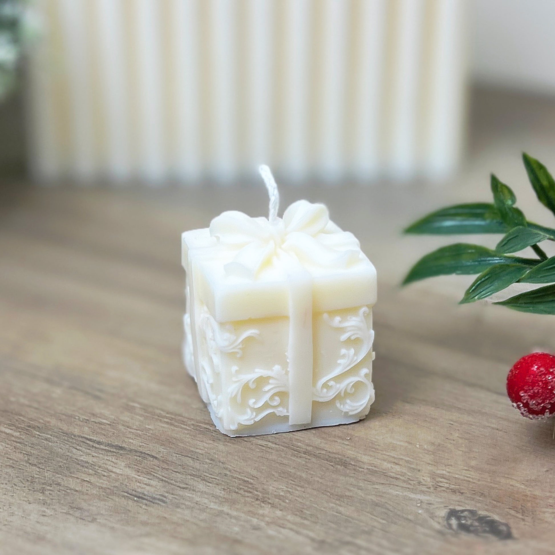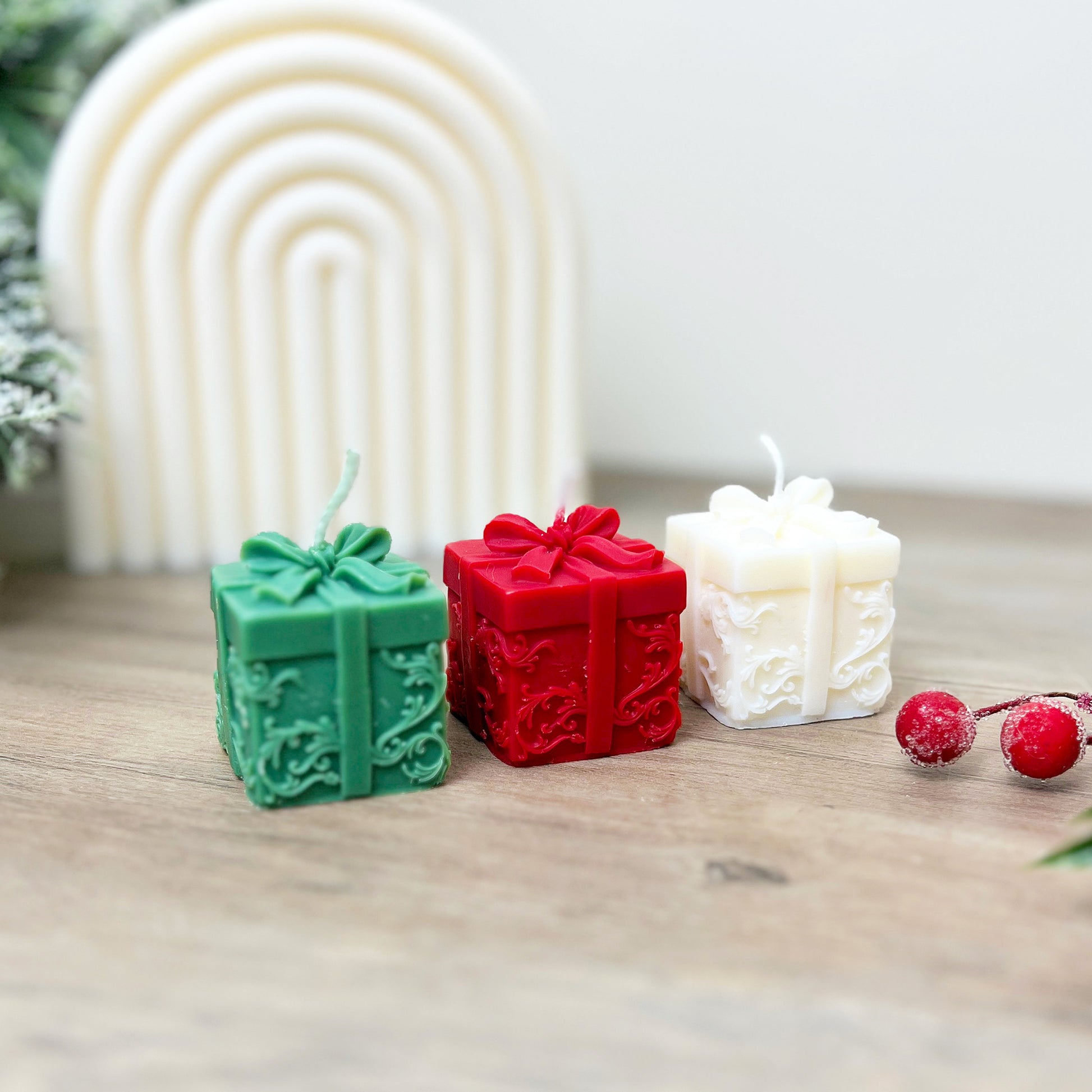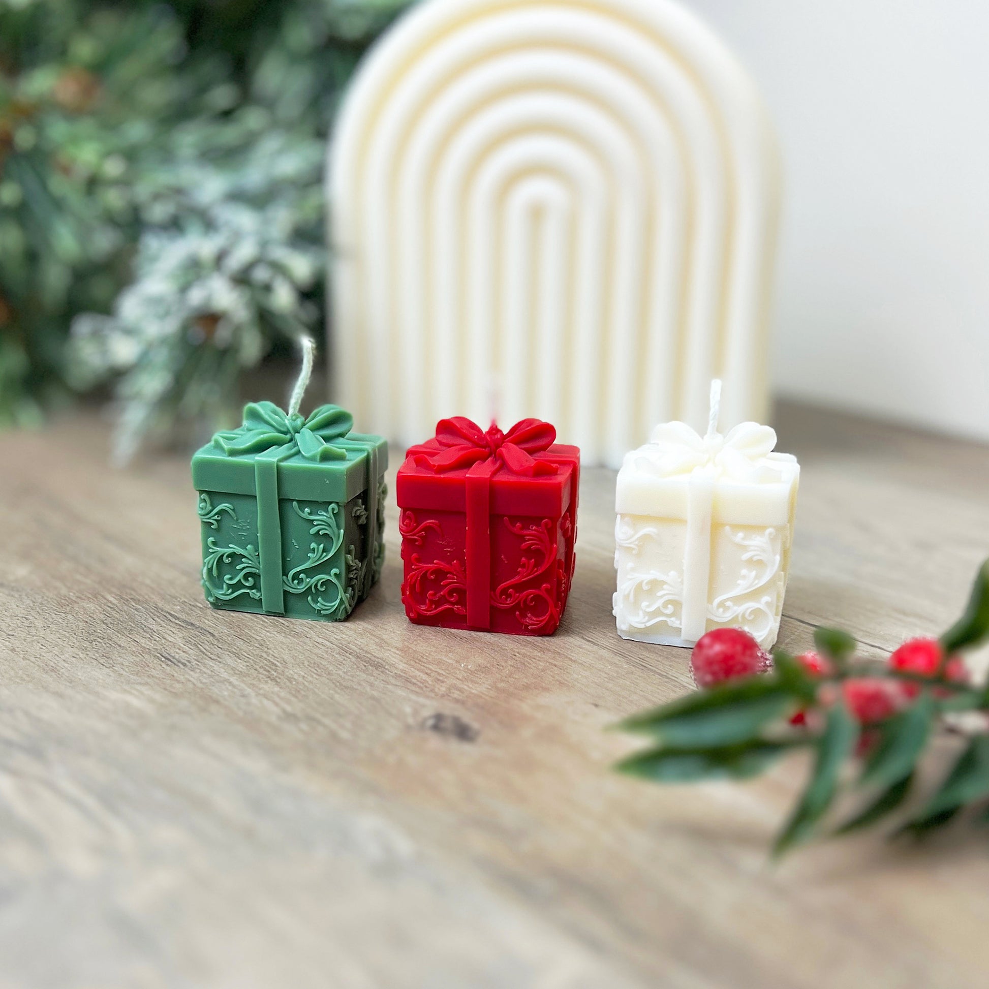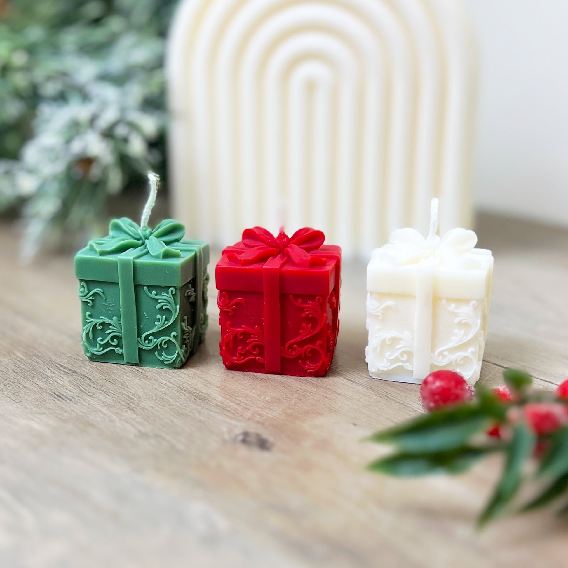 These candles are full of charm and make wonderful Christmas decorations for the smaller spaces of your home. These Christmas present candles feature an adorable gift-wrapped box design, complete with intricate patterns, a ribbon, and a bow on top.