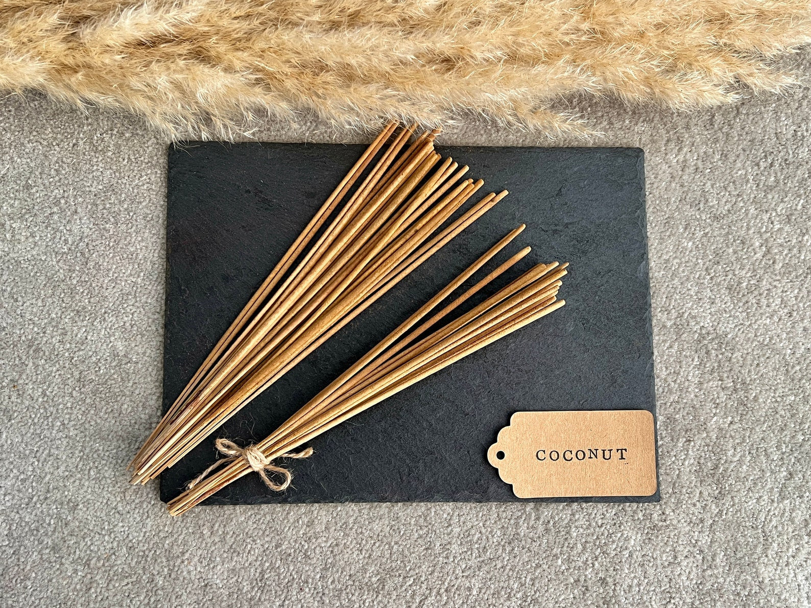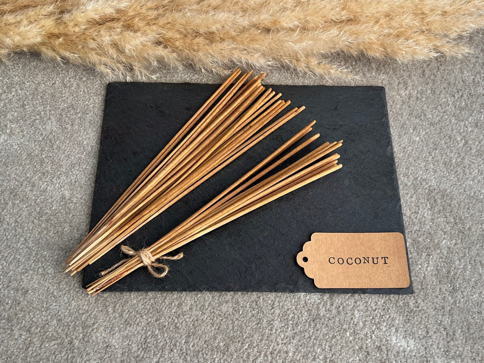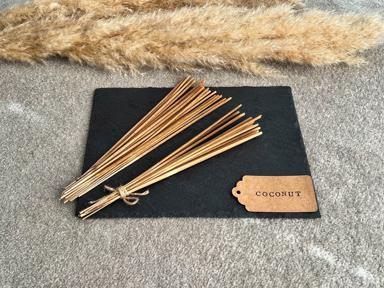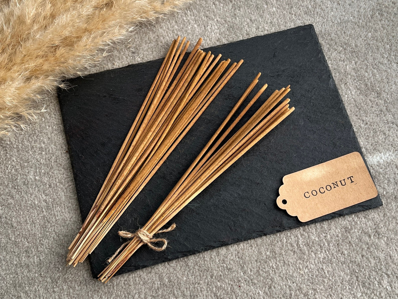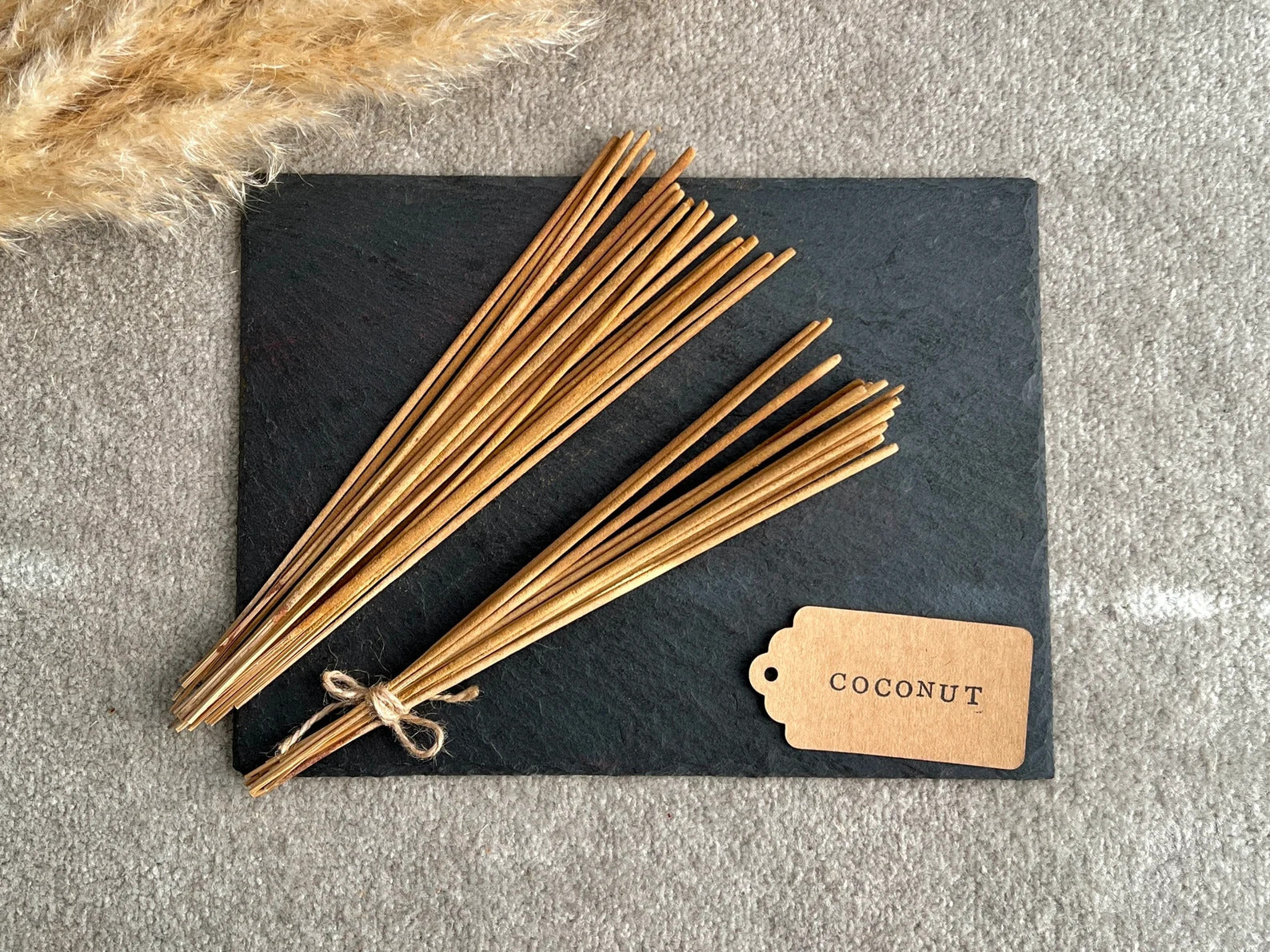 All natural coconut scented incense sticks, made from the finest blend of natural ingredients and essential oils, as well as real coconut extracts, expertly hand rolled and set onto organic bamboo sticks for a clean burn. These tropical coconut scented incense sticks smell so refreshing and will bring the smell of summer into your home or garden, perfect for lighting on a warm spring or summer's evening. The incense has a very fresh and light scent and really does smell just like coconuts, bringing all the warmth of a tropical beach to your home.