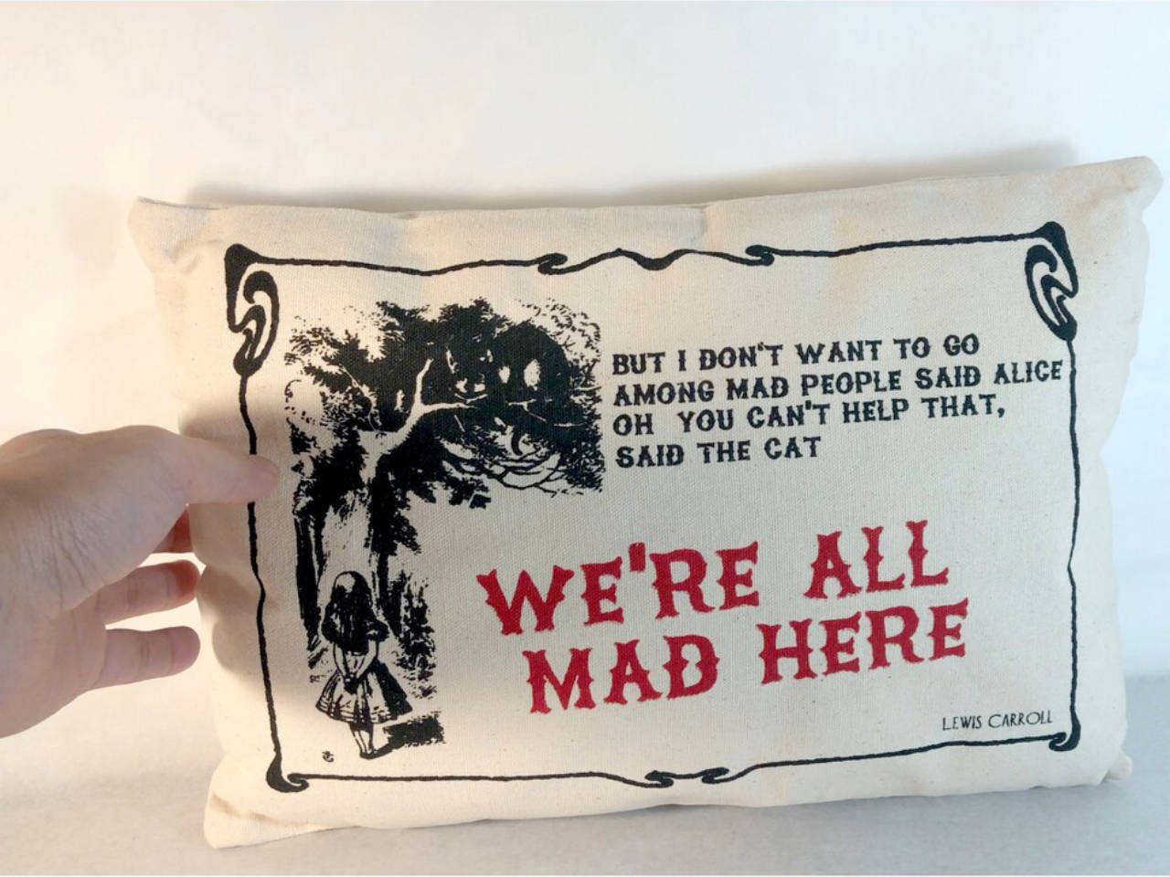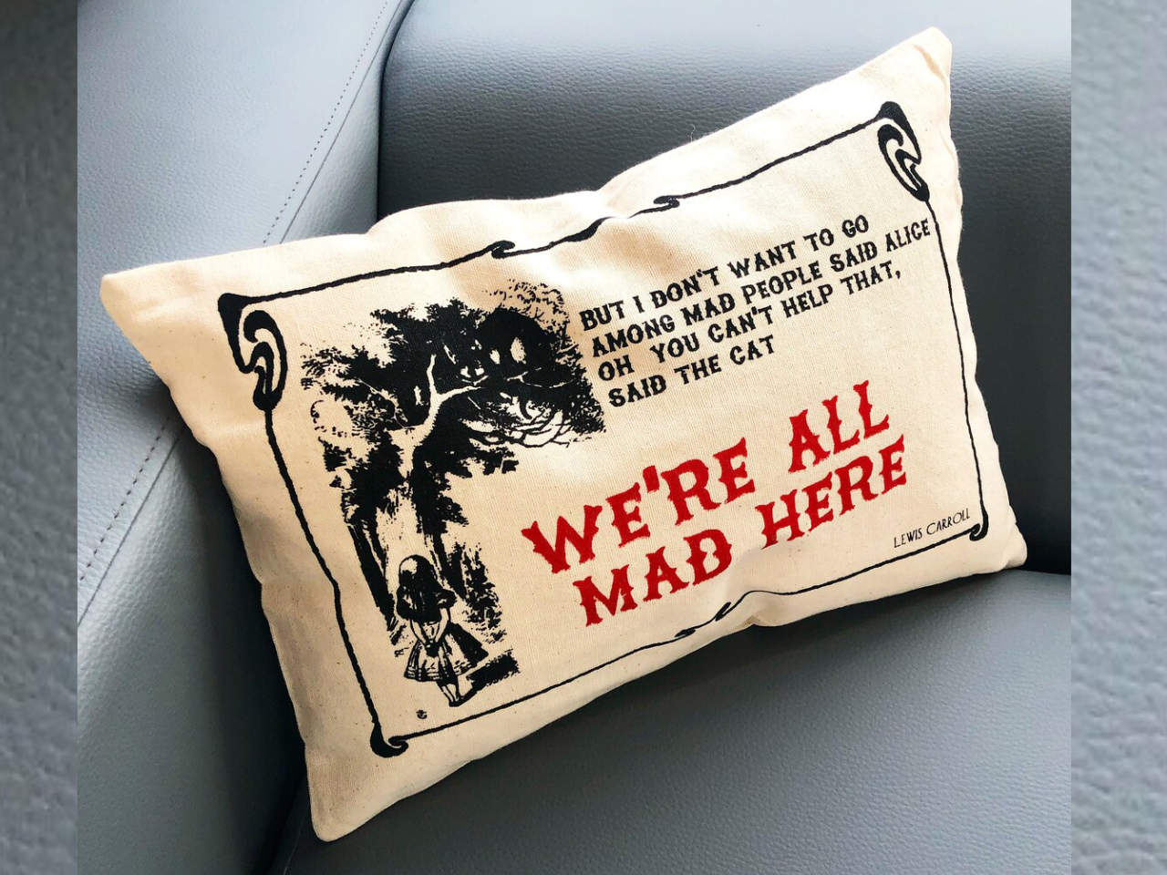 This wonderful & whimsical Alice in Wonderland cotton canvas cushion makes the perfect addition to any home. It is made from great quality soft washed cotton canvas and comes stuffed. The cushion has a Lewis Carroll Alice in Wonderland theme and has one of our favourite wonderland quotes on it from Alice & the Cheshire Cat that reads "But I don't want to go among mad people," Alice remarked. "Oh, you can't help that," said the Cat: "we're all mad here. I'm mad.”