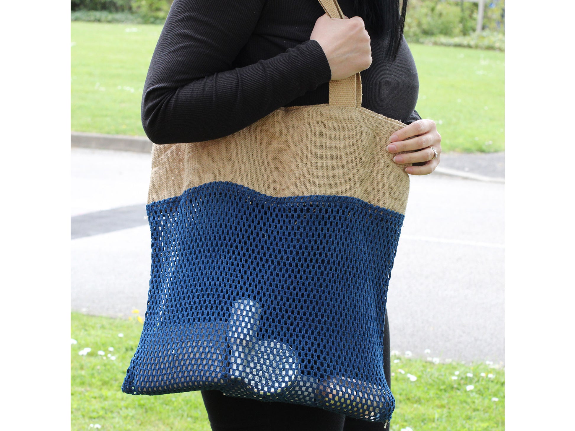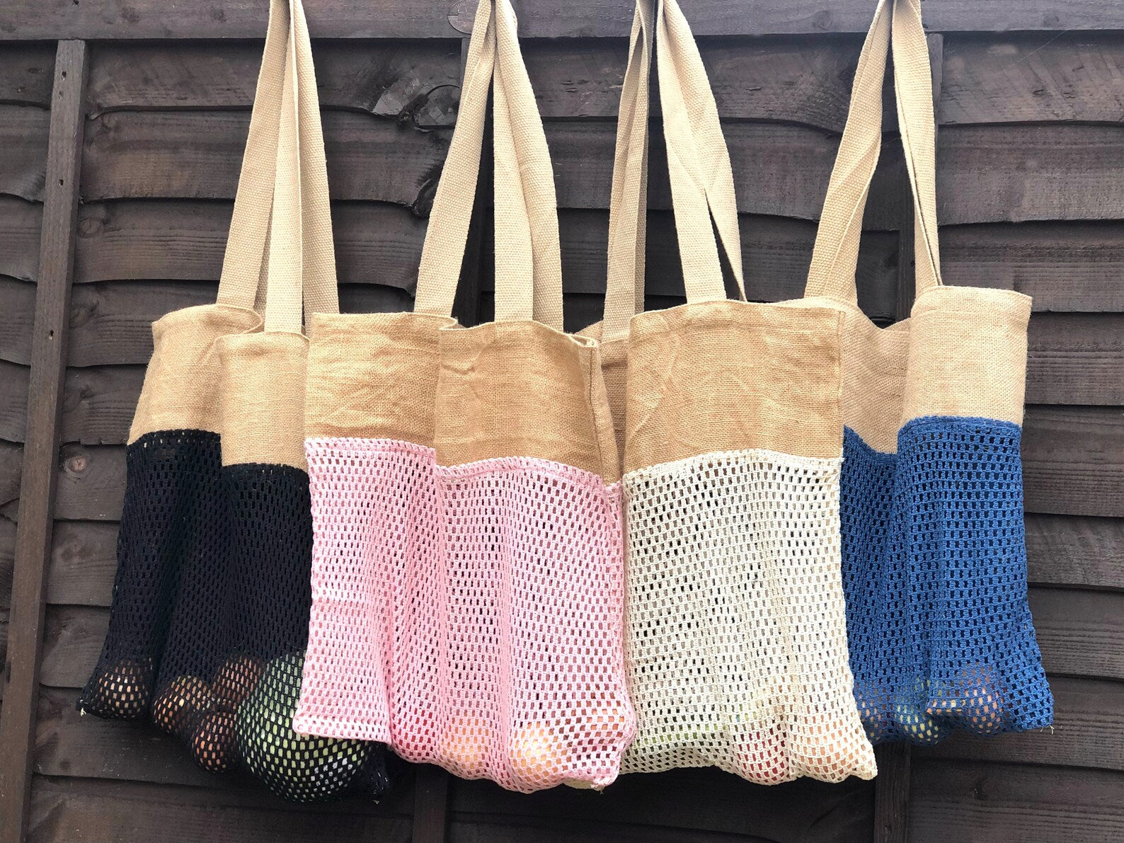 Upcycled jute and cotton tote bags that are completely biodegradable and sustainably made - available in a natural colour, pink, blue and black, all of which have lovely netting designs and a long handle at the top for easy over the shoulder carrying. These natural and eco-friendly market style carrier bags are the perfect small step to take to start living a more sustainable life (plus, they will save you the charges on plastic carriers!)