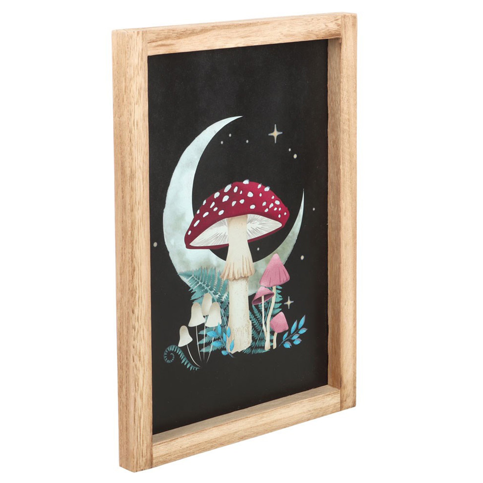 Our fairytale toadstool framed print will bring a woodland touch to your living space. This enchanted wall art features a beautiful red and white toadstool mushroom paired with pastel-colored fungi and leaves, which stand against a black background which makes them really pop. The crescent moon and stars add to the mystical forest theme of the print.