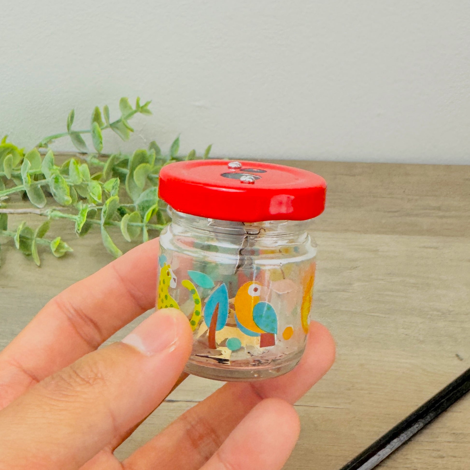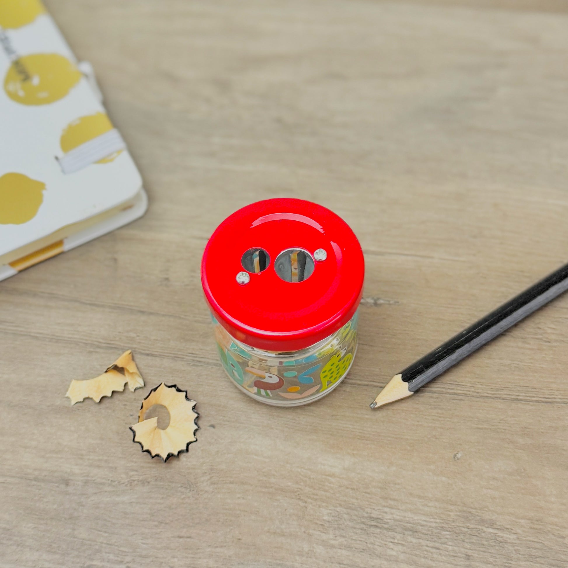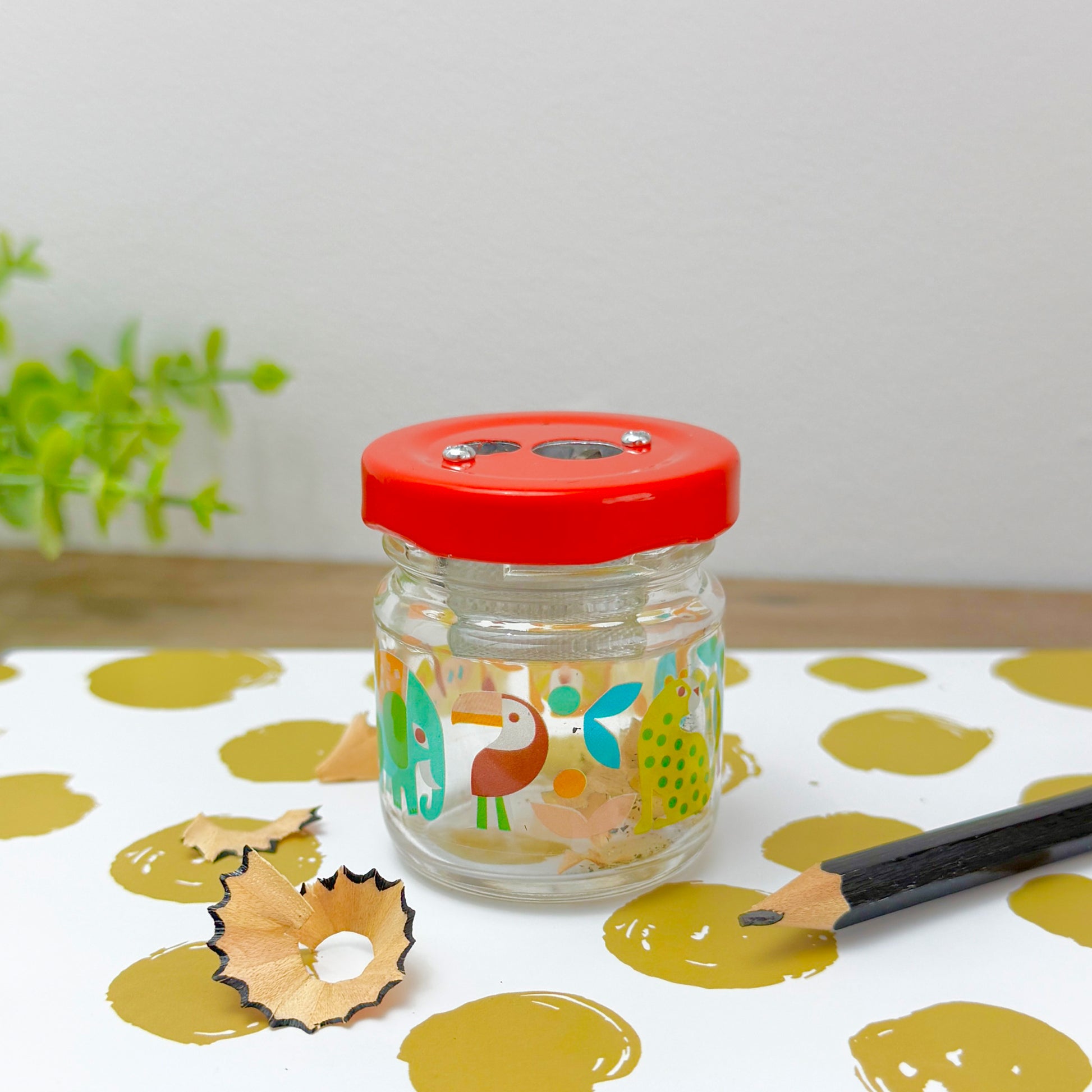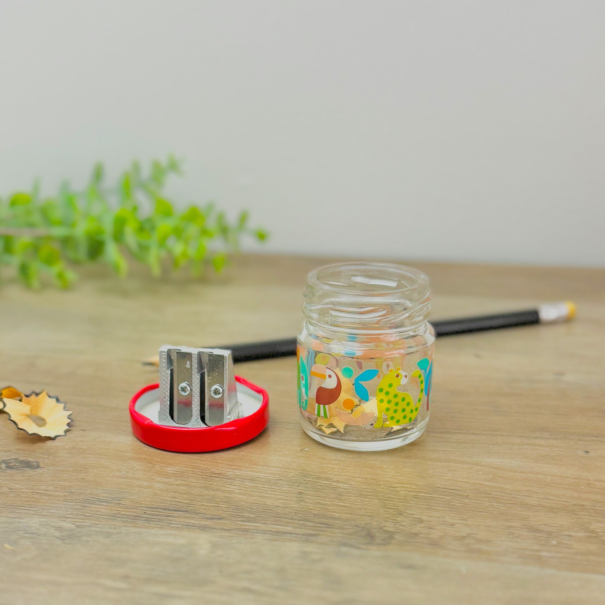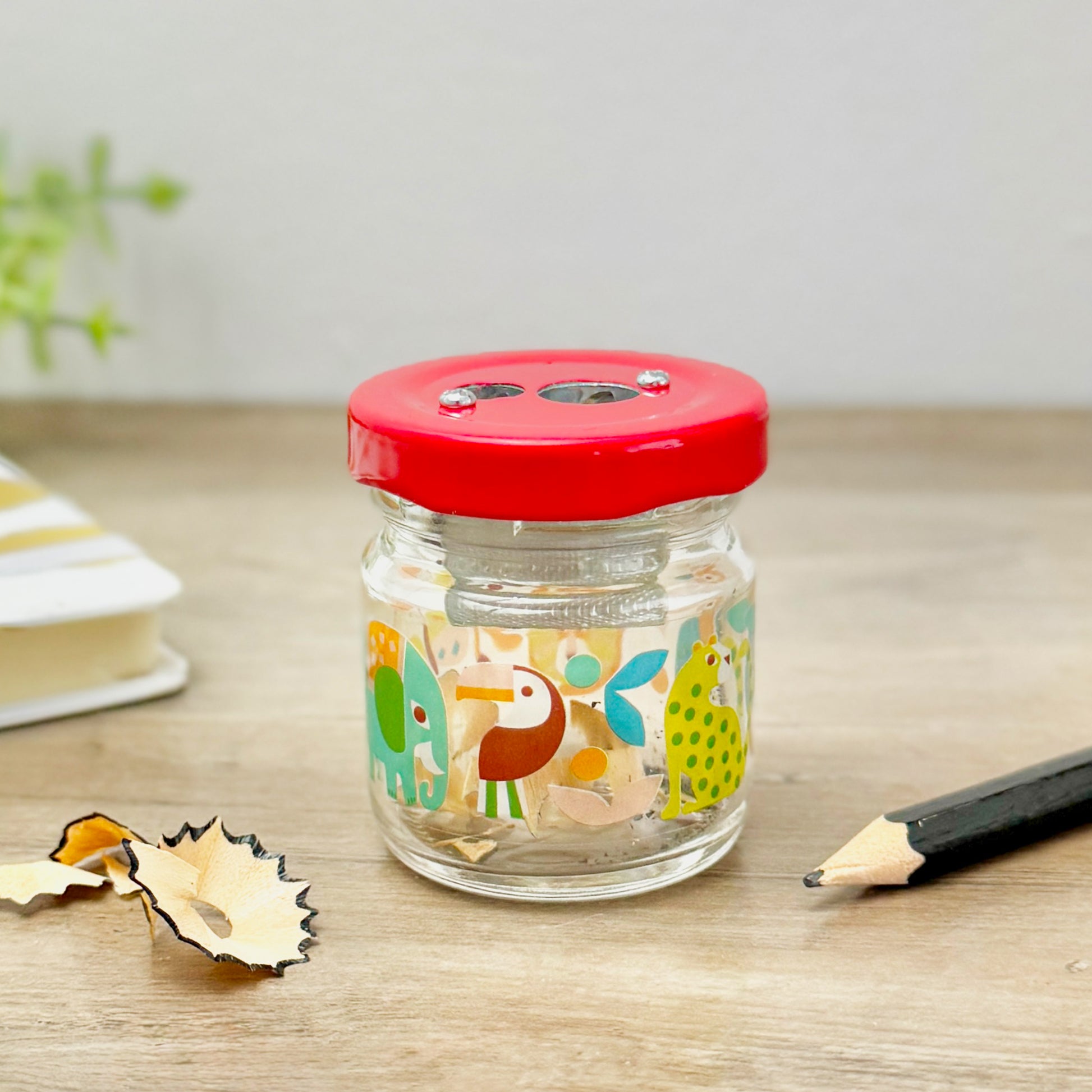 This child friendly pencil sharpener features a durable glass jar printed with vibrant wild animals including lions, elephants, cheetahs, toucans, and butterflies. With a bright red screw-on lid, it neatly collects pencil shavings for easy disposal, keeping pencil cases clean and organised.