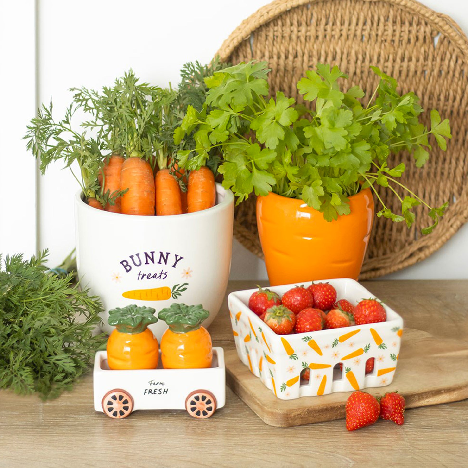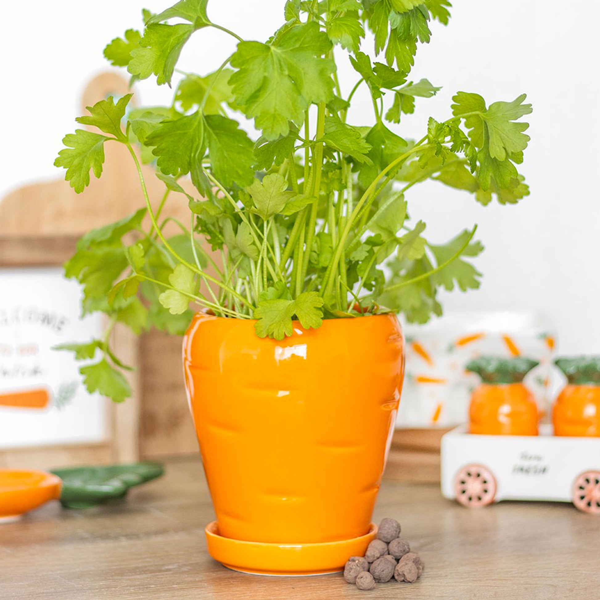 Brighten up your kitchen with our charming carrot-shaped herb planter set, perfect for growing fresh parsley at home. This playful carrot plant pot includes a matching orange drip dish and a box of parsley seed balls, making it an ideal grow-your-own gift for gardeners, foodies, and home chefs.