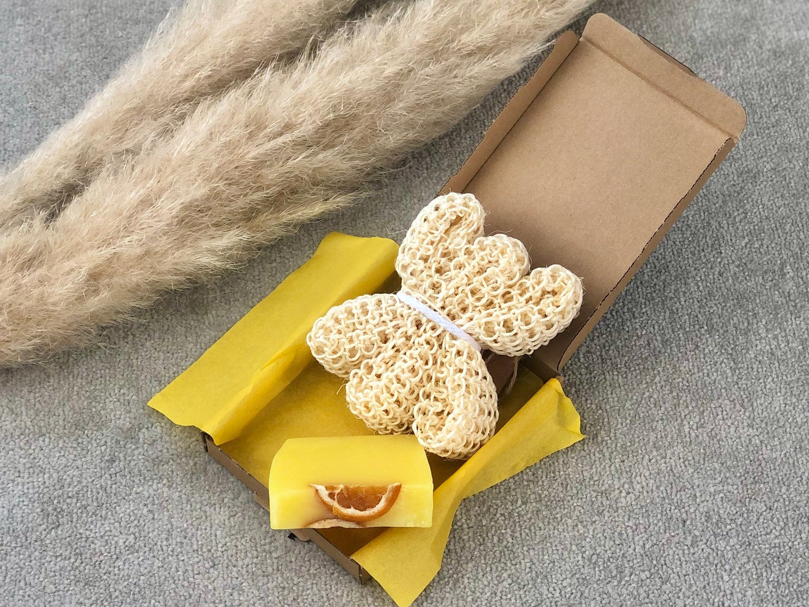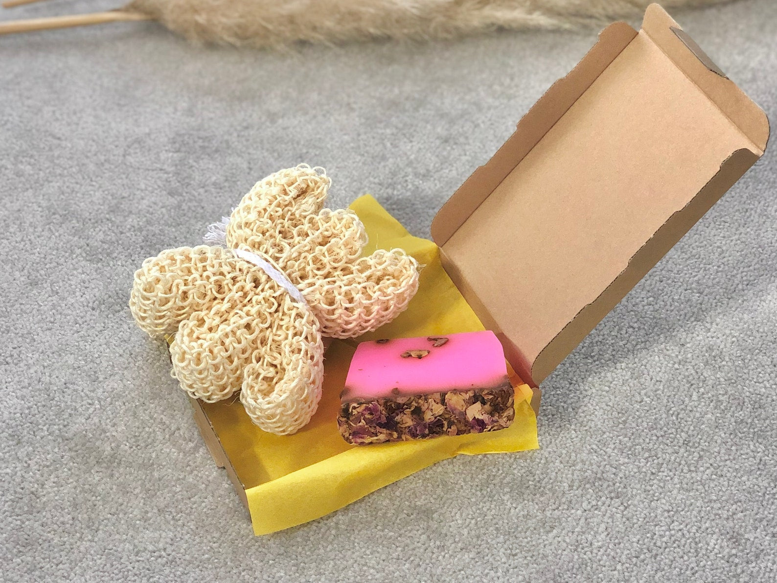 Eco friendly artisan soap gift set with natural sisal sponge for the face and body. This all natural and handmade skincare gift set includes a bar of luxurious organic soap in a variety of scents along with a star shaped sisal face and body sponge. These gorgeously decadent soaps are all handmade by our team here in the UK and come in a variety of gorgeous scents including rose, honey & citrus fruits!