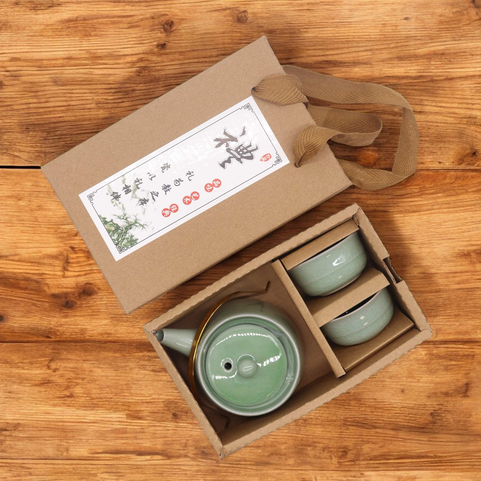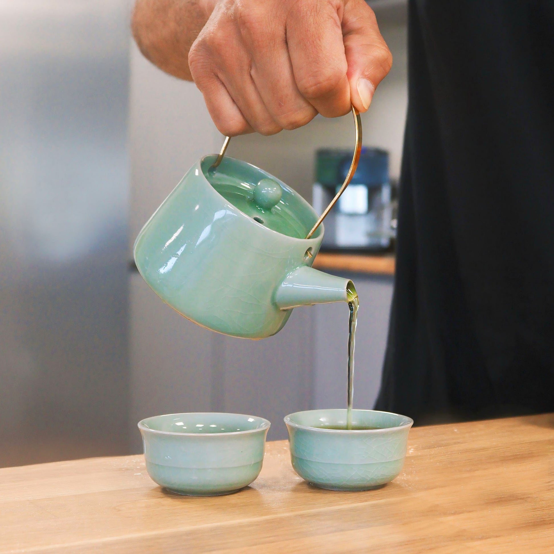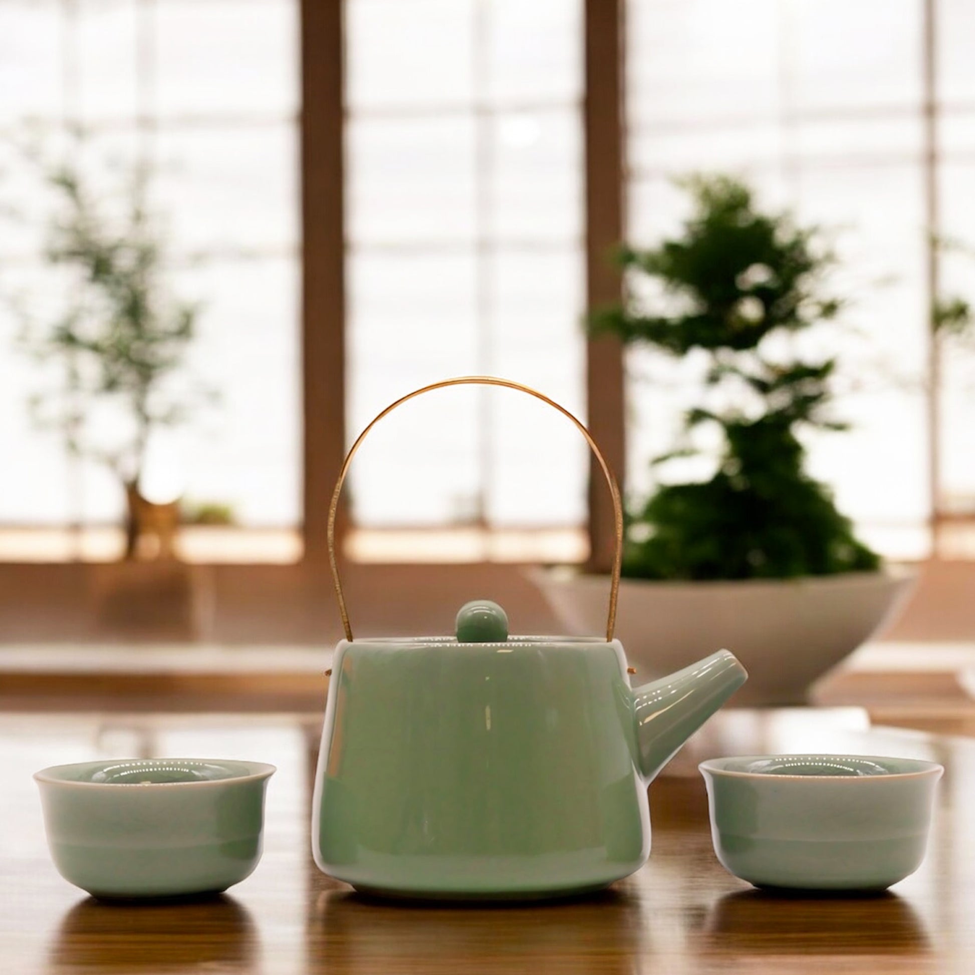 Our jade green tea set includes a glazed green teapot and two matching green teacups, perfect for brewing herbal tea, green tea, or loose leaf teas. This tea set makes the perfect gift for tea lovers! The teapot has a minimalist design and the sleek jade glaze looks fantastic and provides protection against scratches.
