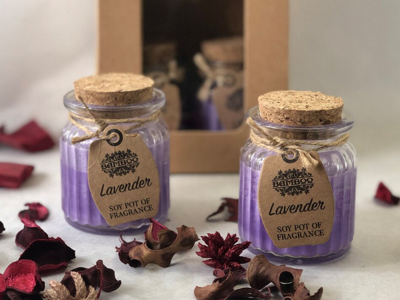 Our Lavender soy wax candles are presented in glass jars with a cork lid. Each candle has a natural label attached with jute twine. They are perfect for this festive time of year and will add a lovely atmosphere to your home! They make a great little gift. The Soy Pot Candle is made to ensure purity and quality and are great value.