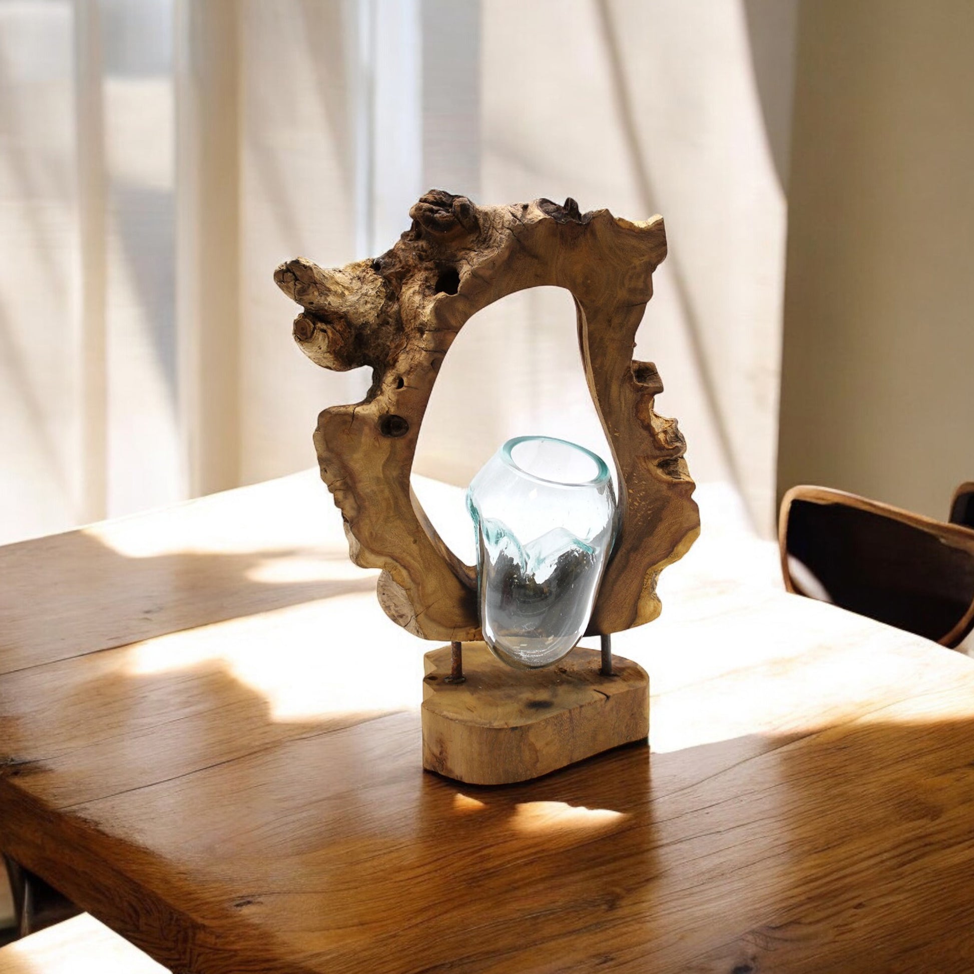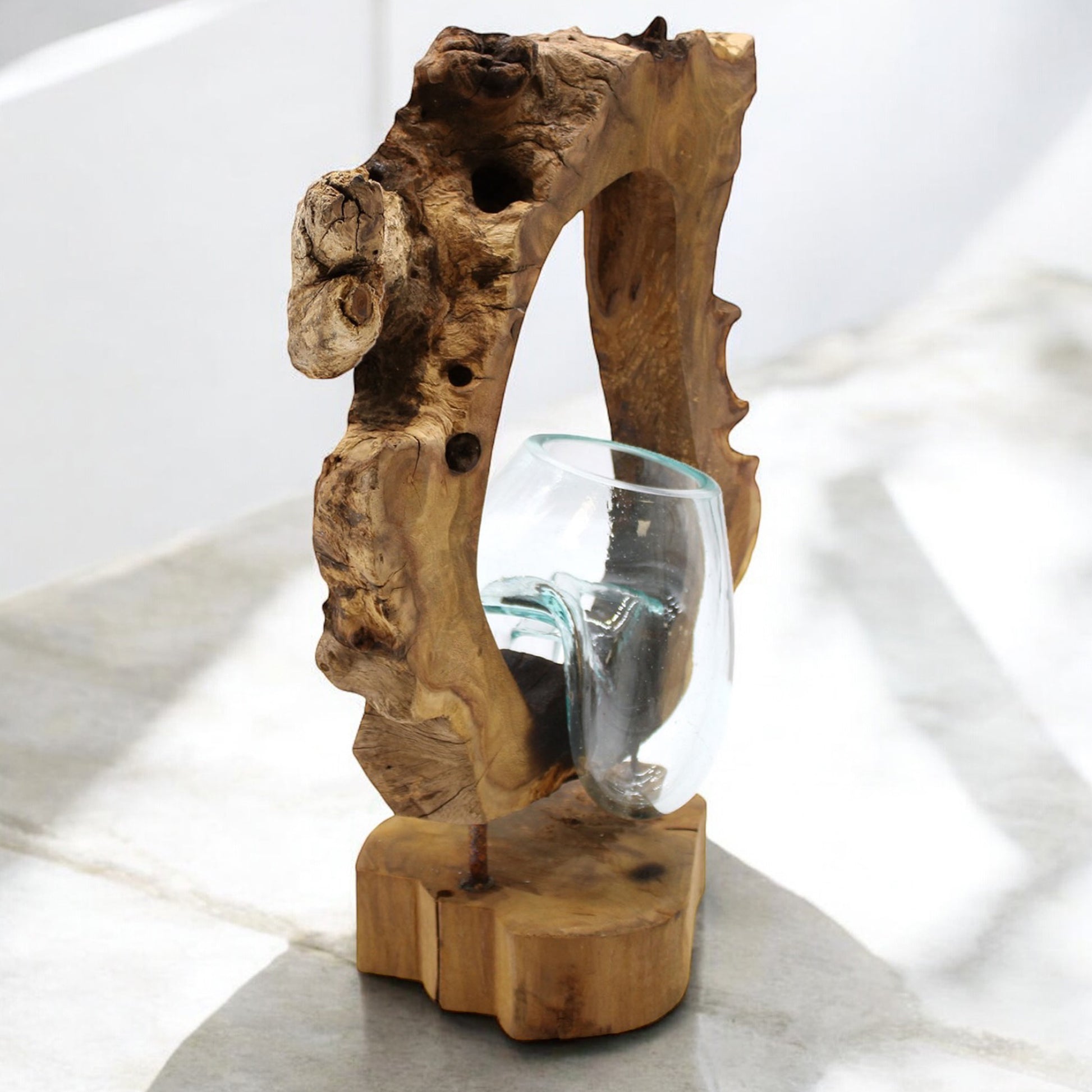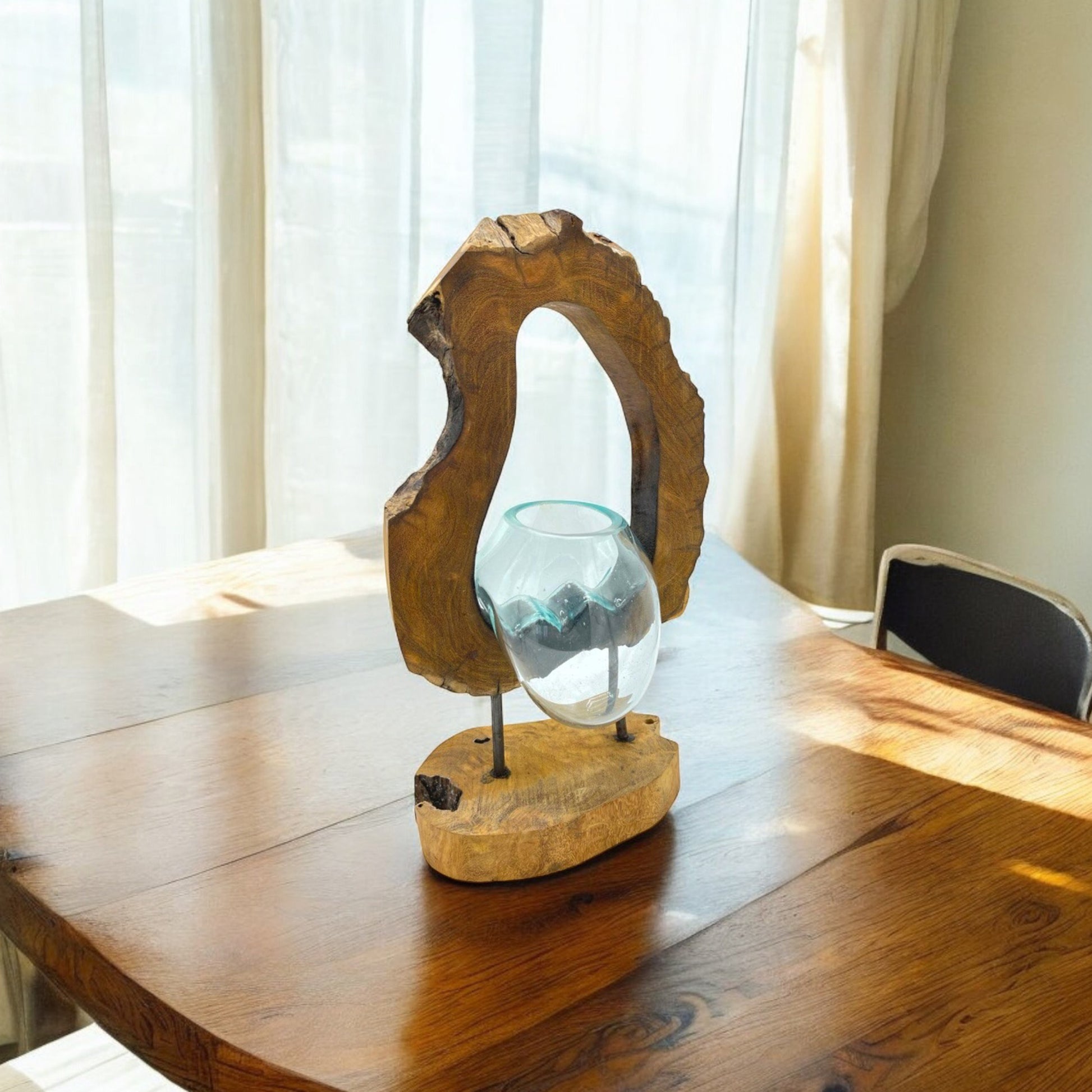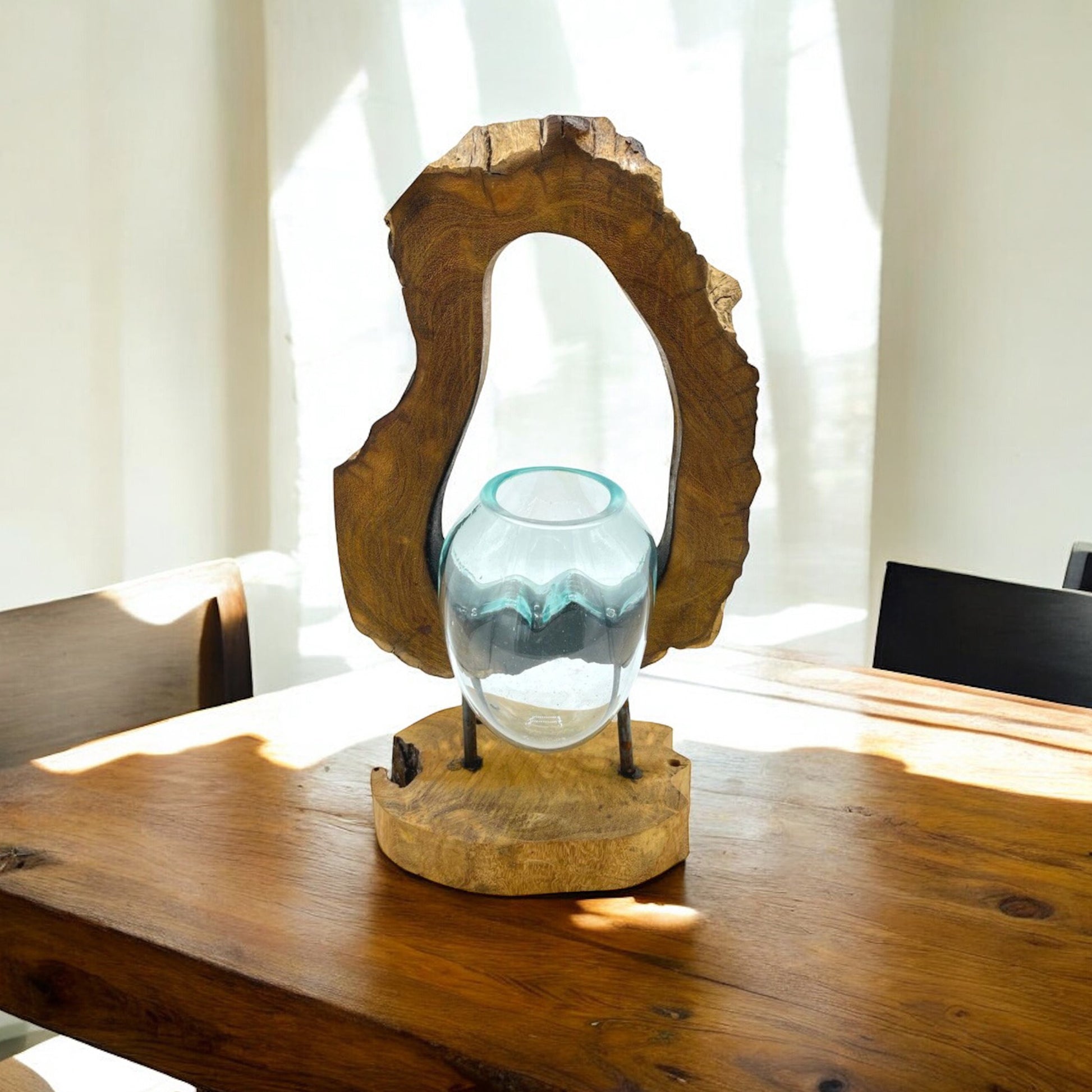 Due to variations in the wood sizes and shapes, the nature of melting the glass by hand and the fact this product is handmade by artisans, slight variations may occur in the shape of the glass, as well as colour and shape of the wood. There will also be small air bubbles present in the glass due to the melting process.