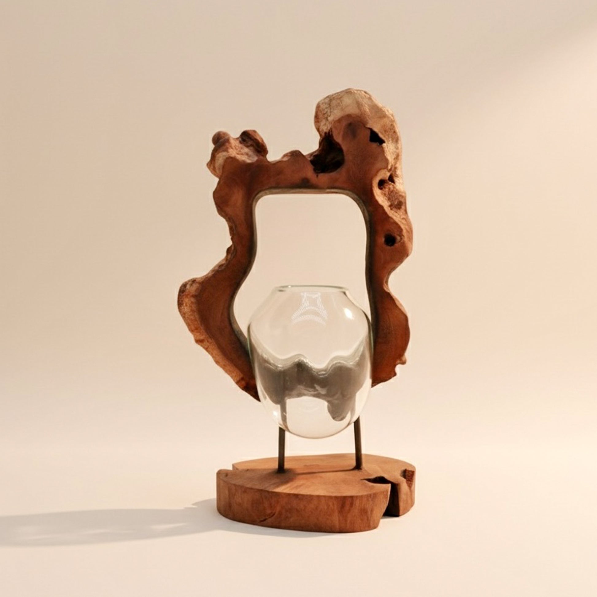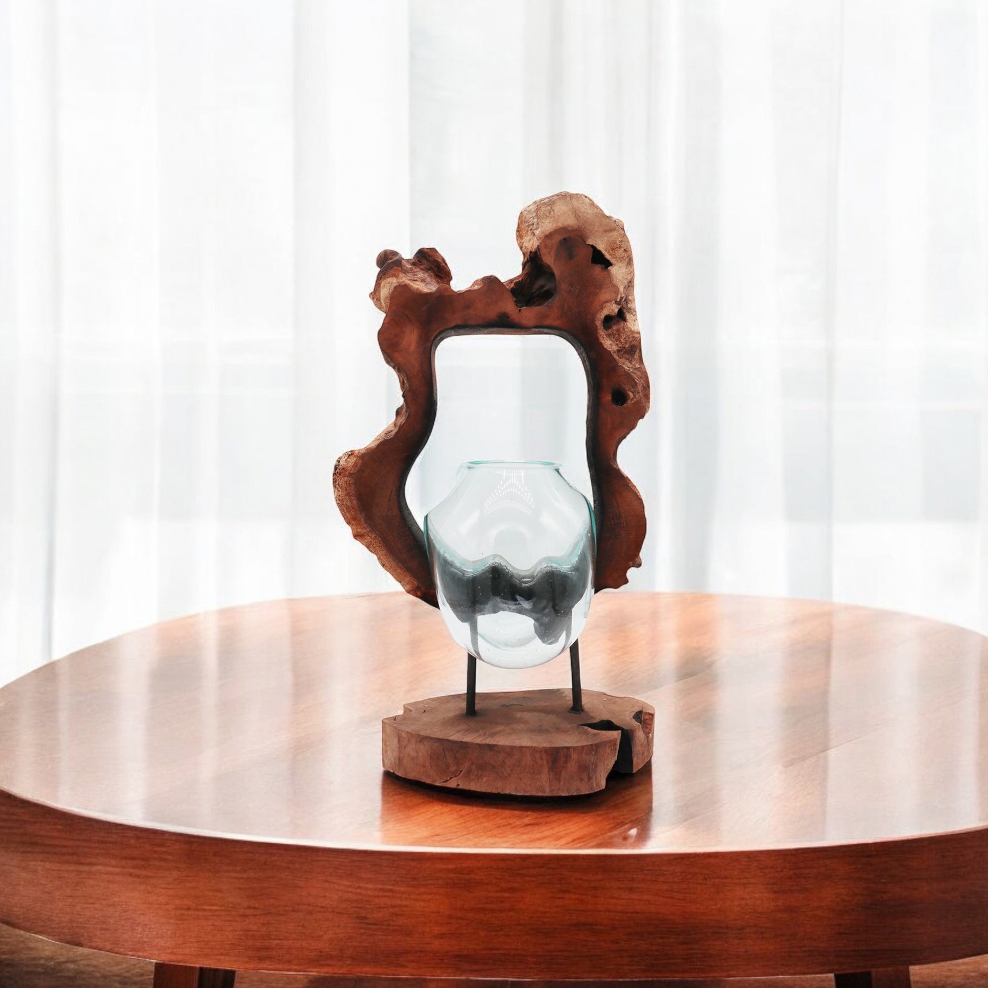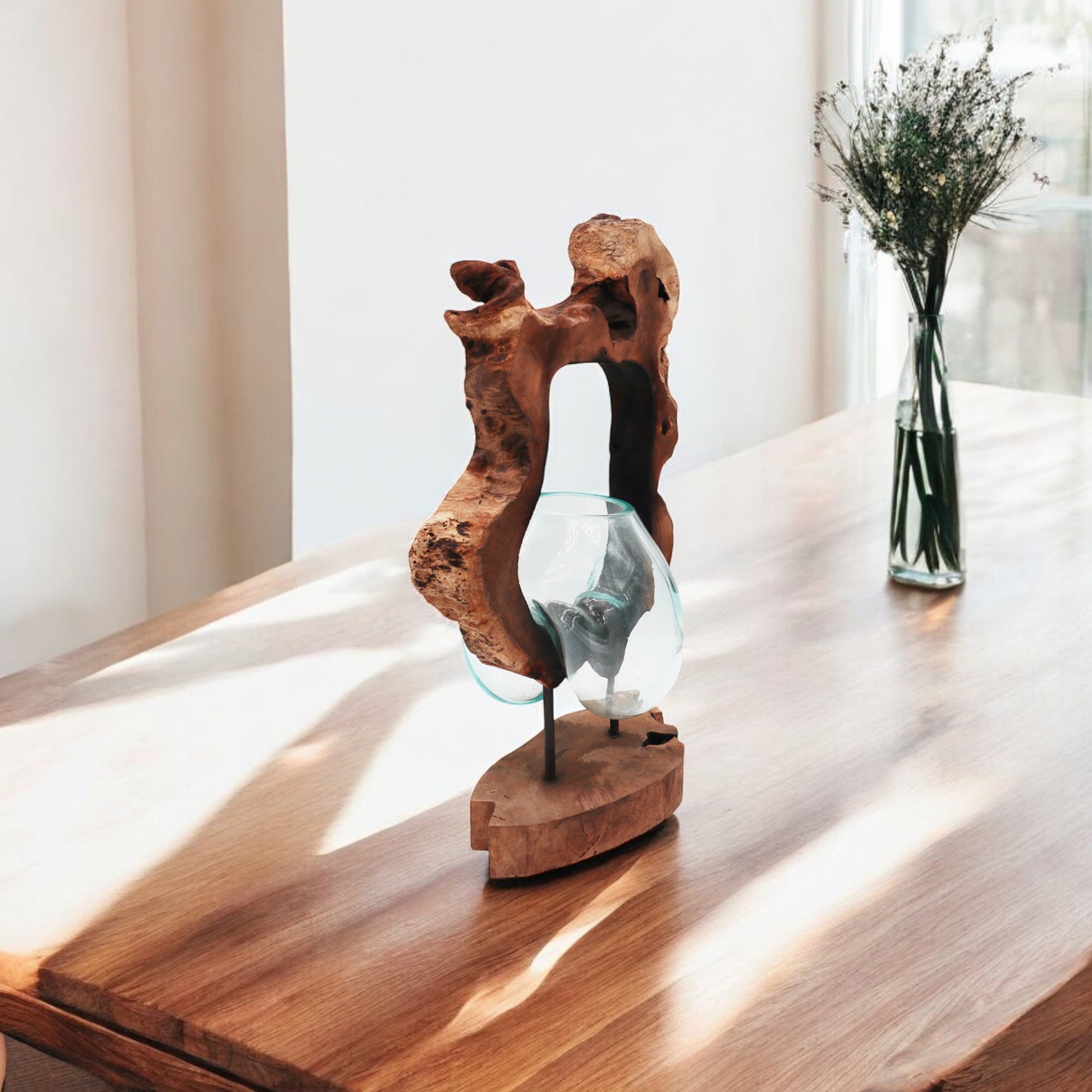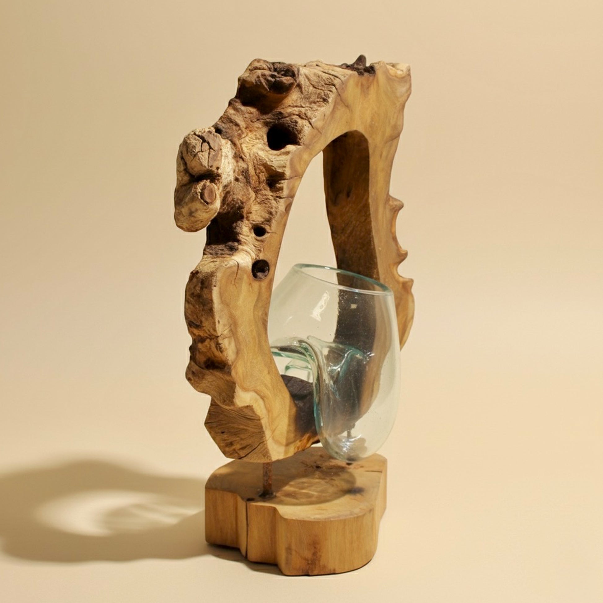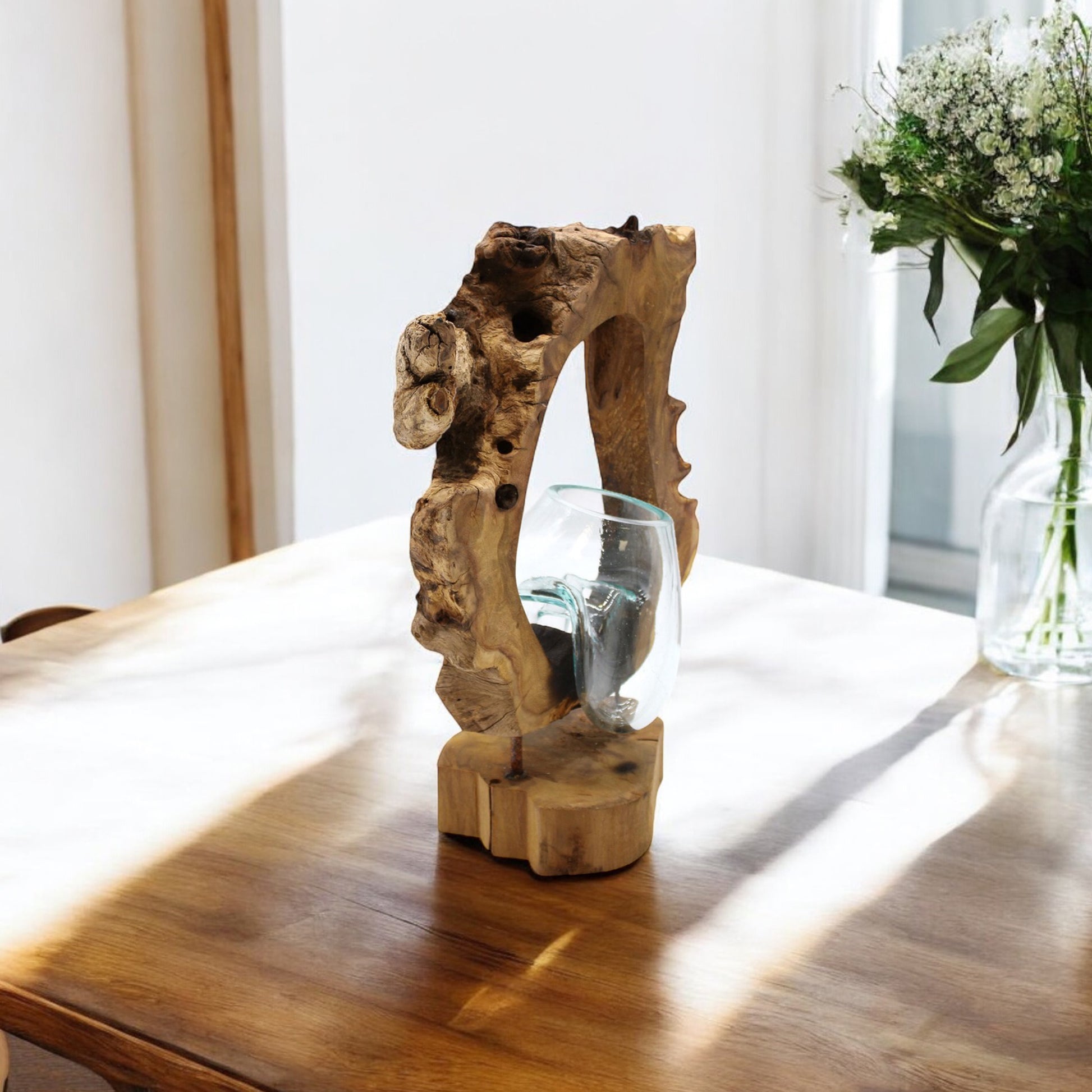 Due to variations in the wood sizes and shapes, the nature of melting the glass by hand and the fact this product is handmade by artisans, slight variations may occur in the shape of the glass, as well as colour and shape of the wood. There will also be small air bubbles present in the glass due to the melting process.