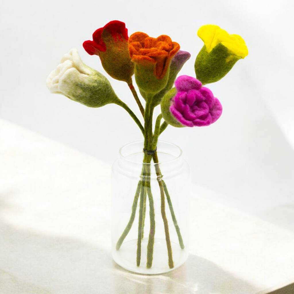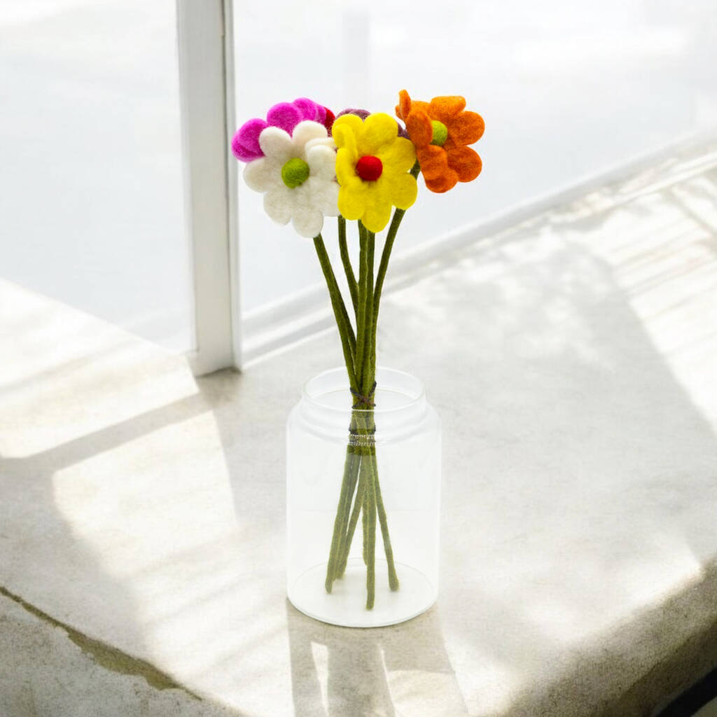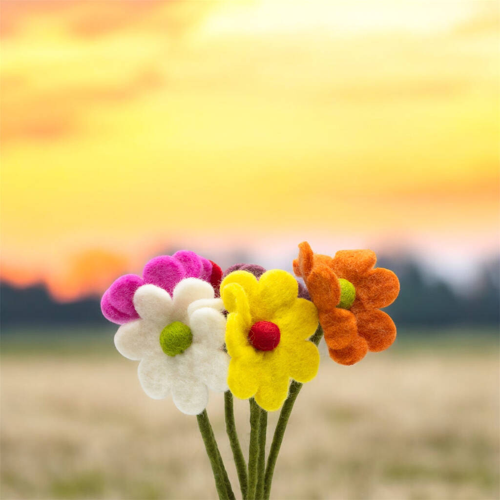Surprise your loved one with our six felt flower bouquet! These faux flower bouquets are ideal for those who enjoy flowers without the upkeep, these unique floral gifts add the beauty of real flowers to any home. Perfect for rustic or modern homes, these flowers make a thoughtful Mother's Day or Valentine's gift. No need to keep changing or refreshing them, they're the perfect gift flowers for her!