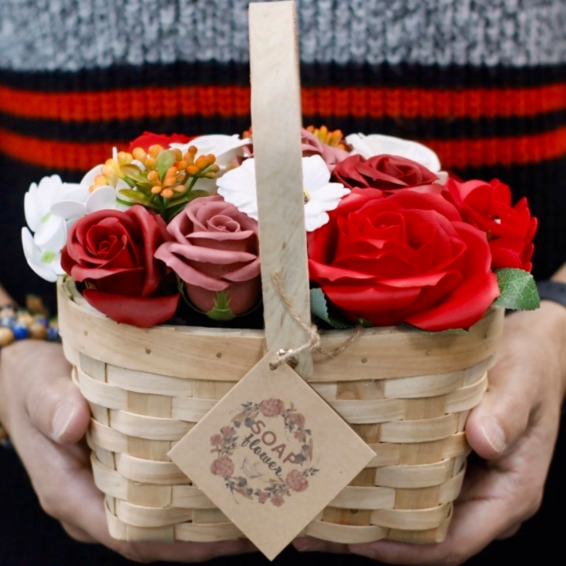 Treat someone special to our wicker gift basket filled with handmade soap flower bath bombs, a unique and thoughtful gift for flower lovers. Designed to look like a real basket of blooms, this floral hamper includes beautifully crafted soap flowers that double as bath bombs, subtly scented with the fragrance of real flowers.