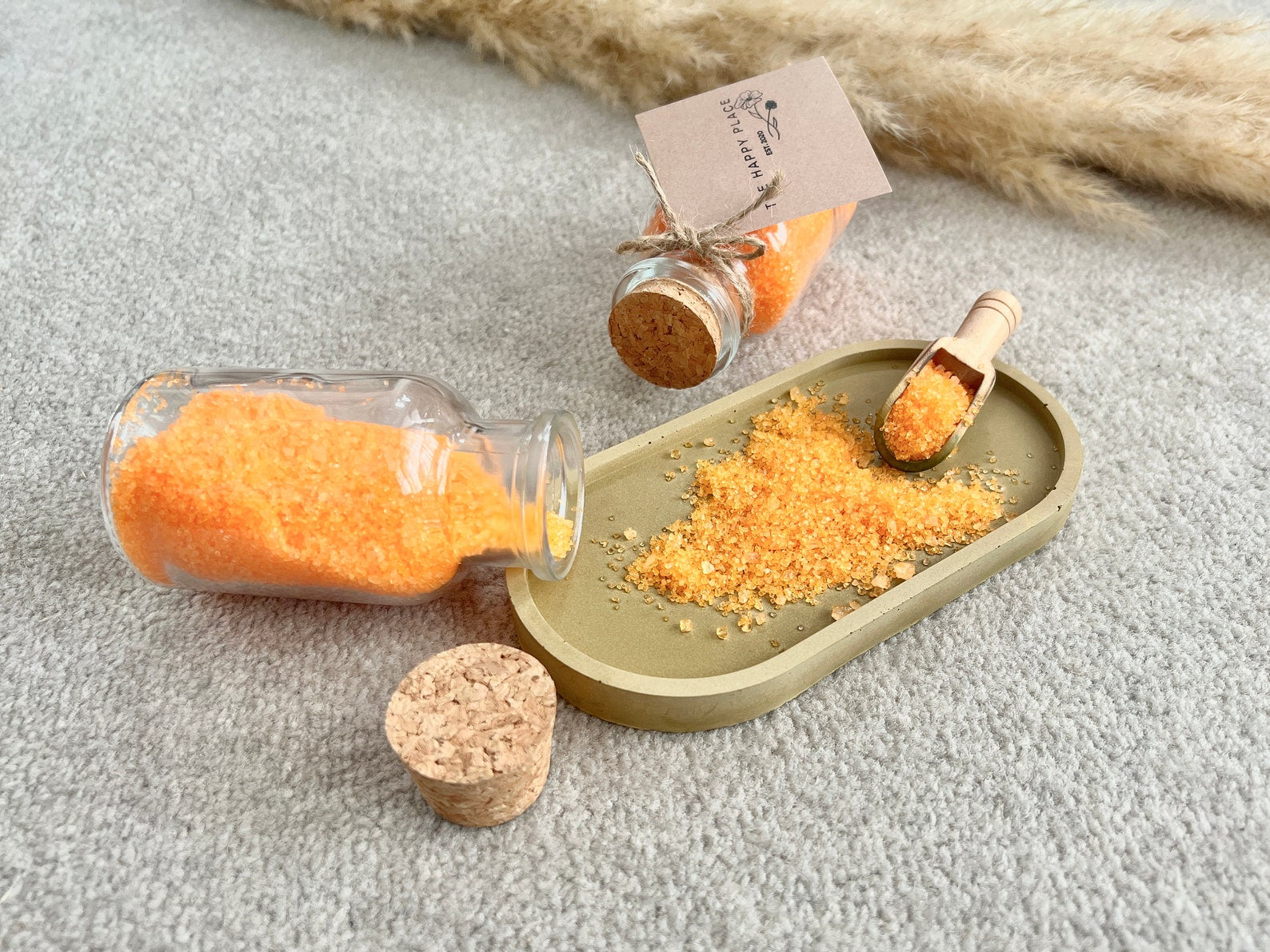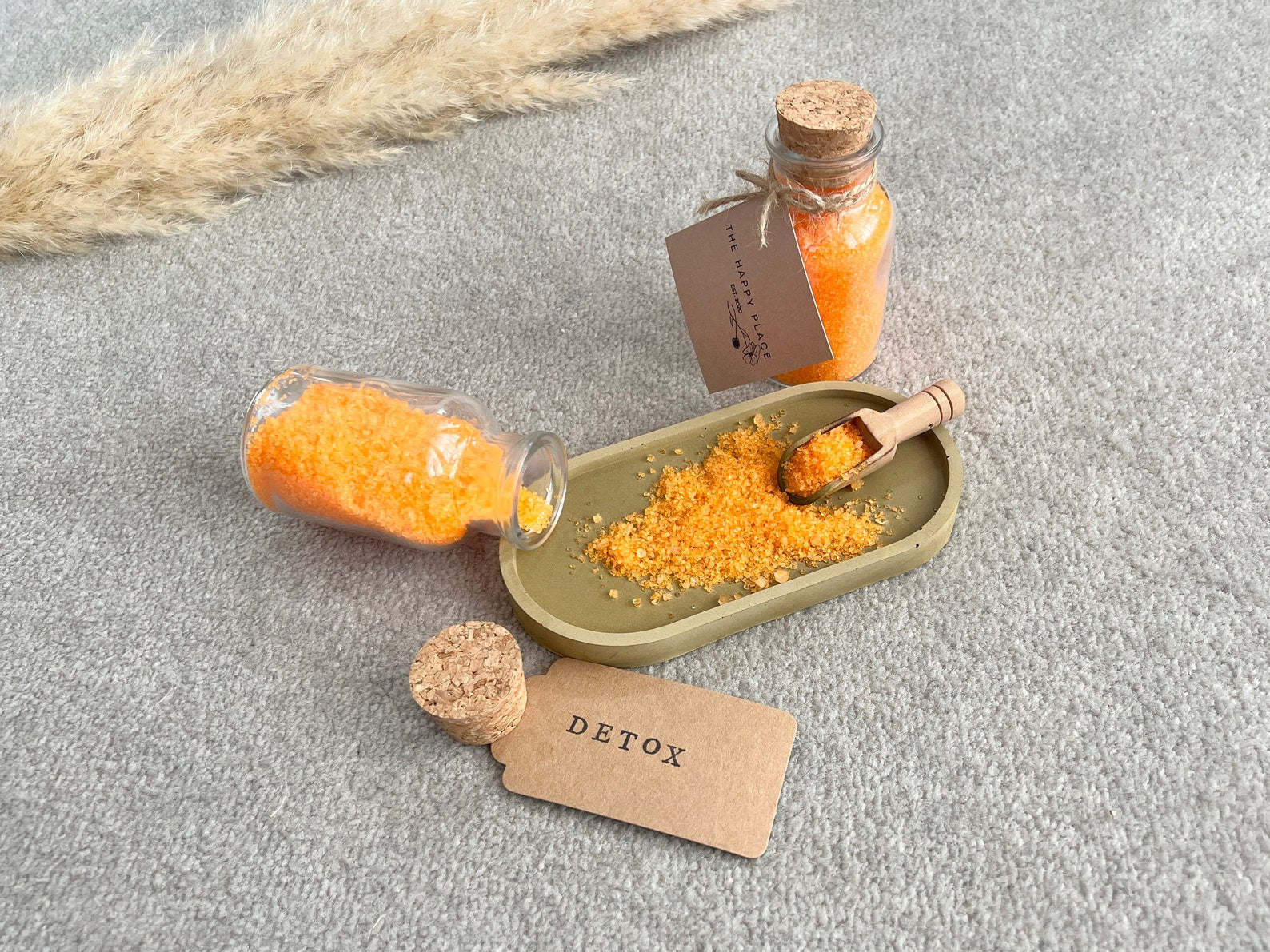 Home total detox bath salt set, with handmade bath salts to give you a full mind and body detox, made from high quality essential oils and natural sea salts. The bath salts come in a lovely glass mason jar with a rustic cork lid to keep your bath salts dry and easy to store. These bright orange bath salts are made using all natural essential oils that give them the most wonderful refreshing scents of May Chang, Tea Tree & Juniper, which will relax you and allow your body and mind to completely detox of all the stress, toxins and negativity you might be carrying around with you. Simply add 2-3 teaspoons of these bath salts to your bath for a detoxing and relaxing soak.