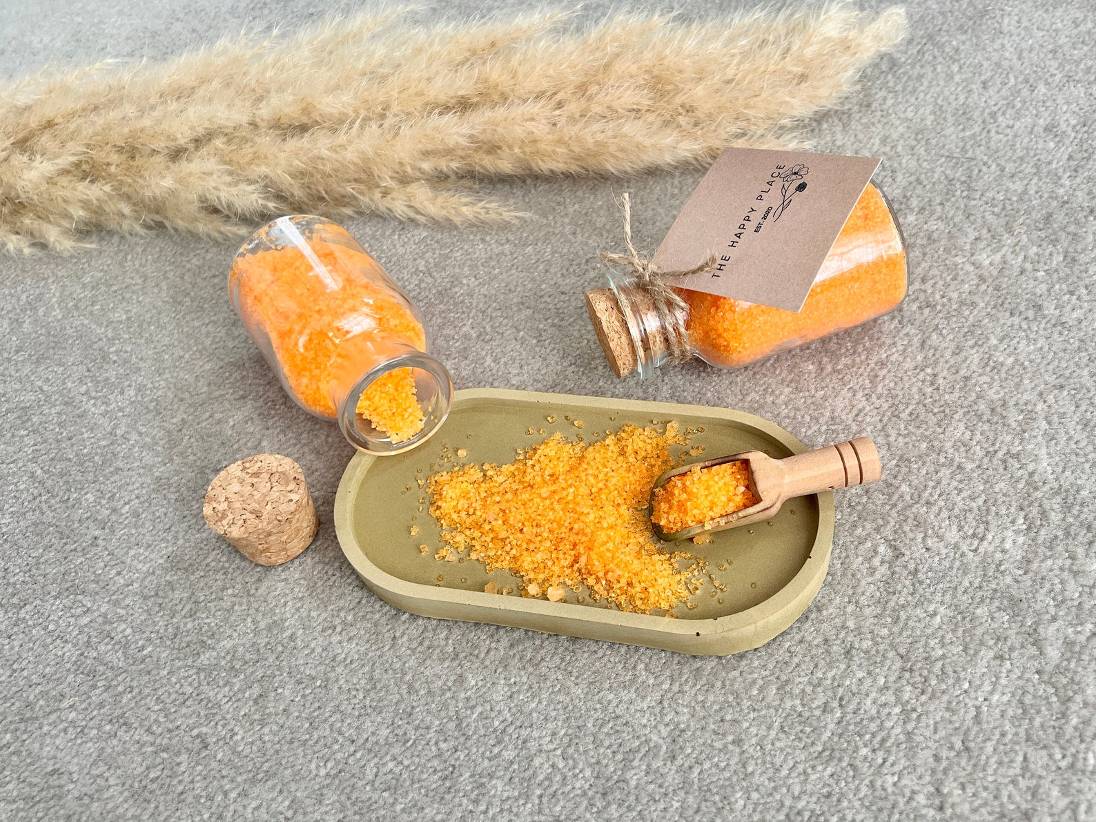 The glass mason jar is the perfect way to keep your bath salts as it keeps them fresh and preserves their scent, whilst also looking interesting and adds a touch of colour to your bathroom as you can see the bright orange bath salts inside.