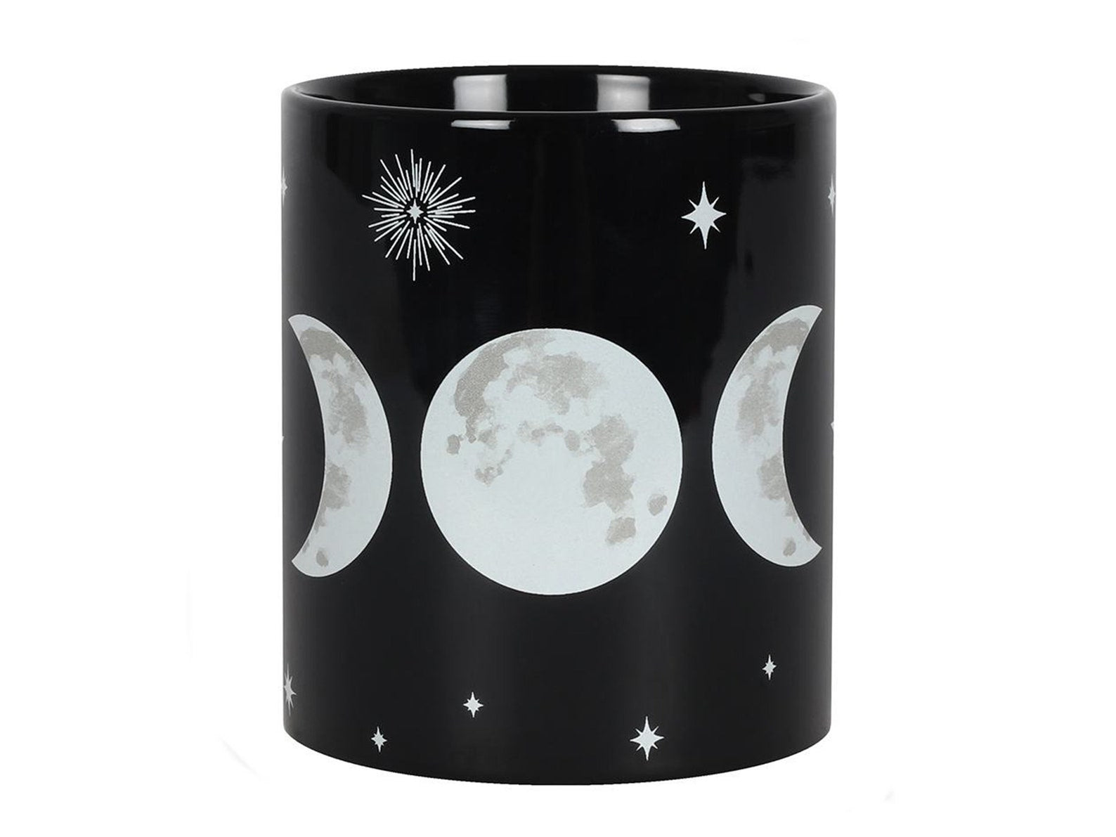 Black and white china tea cup and coffee mug featuring a wonderful lunar triple moon design, showing 3 phases of the moon as it goes from a waxing to a waning moon and features lots of lovely little white stars all across the mug in varying sizes. The mug is perfect for all of your tea and coffee and the lovely design is sure to brighten up your day each time you have a cuppa!