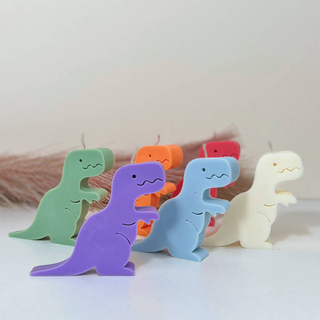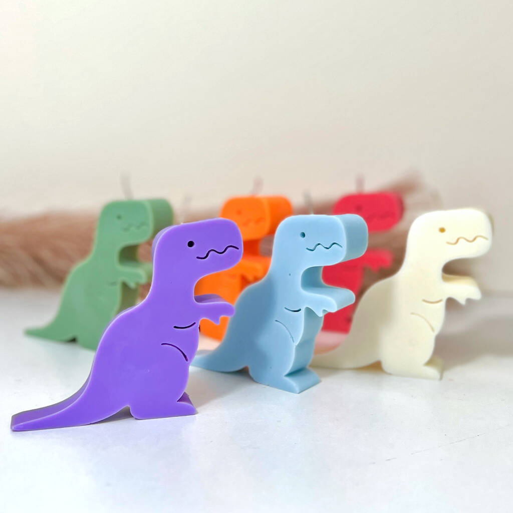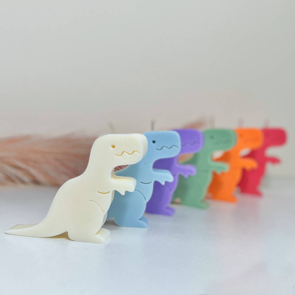 T. Rex dinosaur candle in pastel colours. These dinosaur gift candles are made in a fearsome Tyrannosaurus Rex design and are made from all natural soy wax.