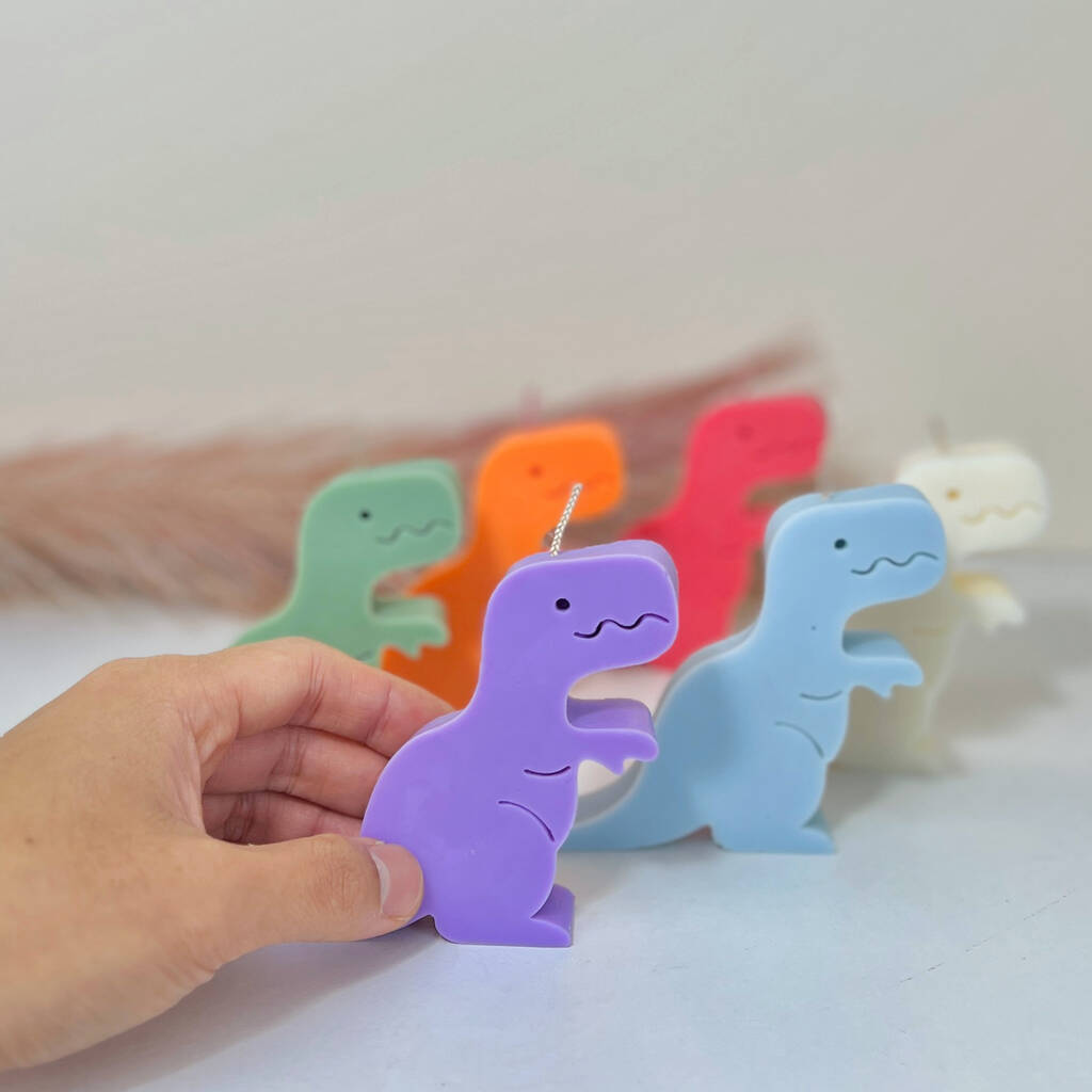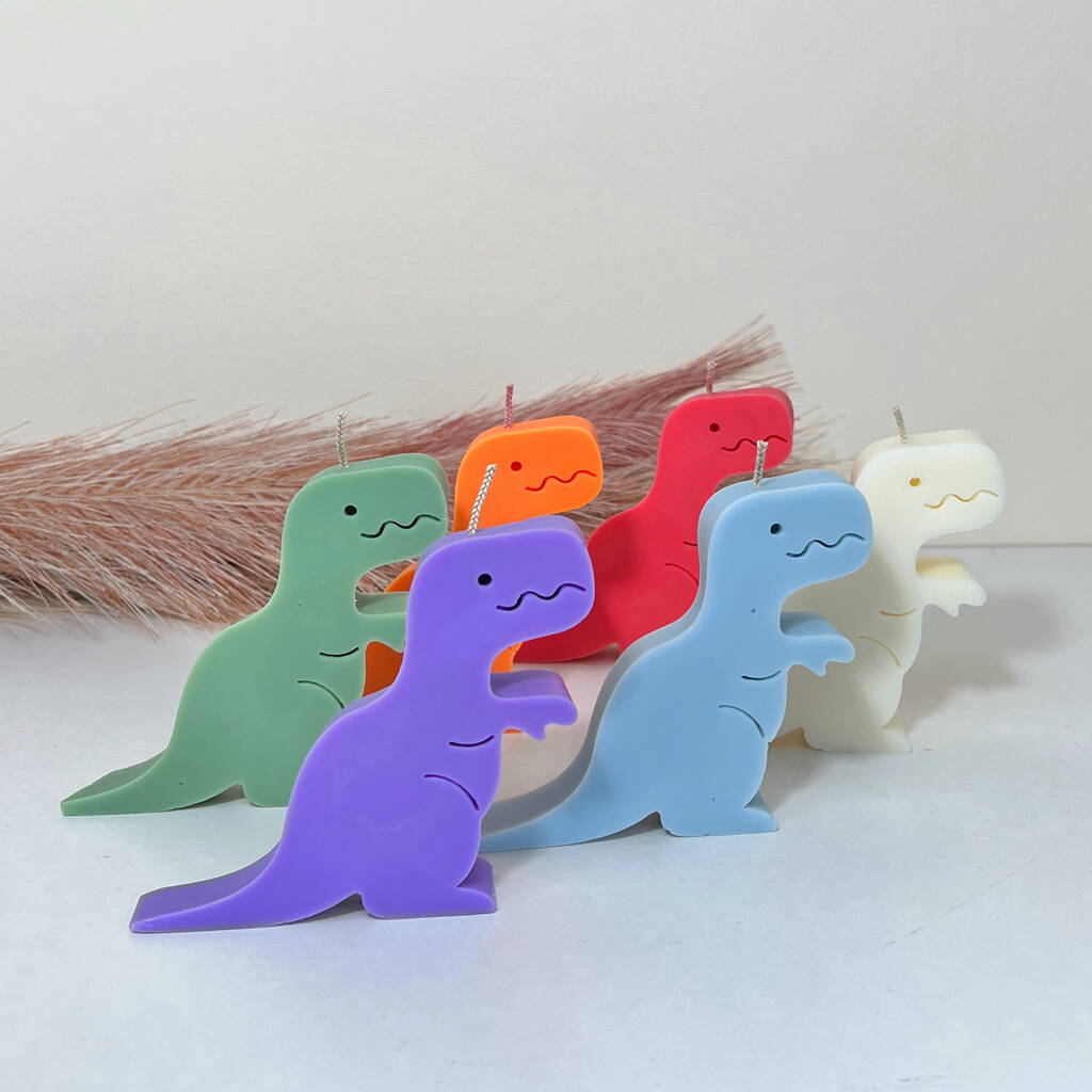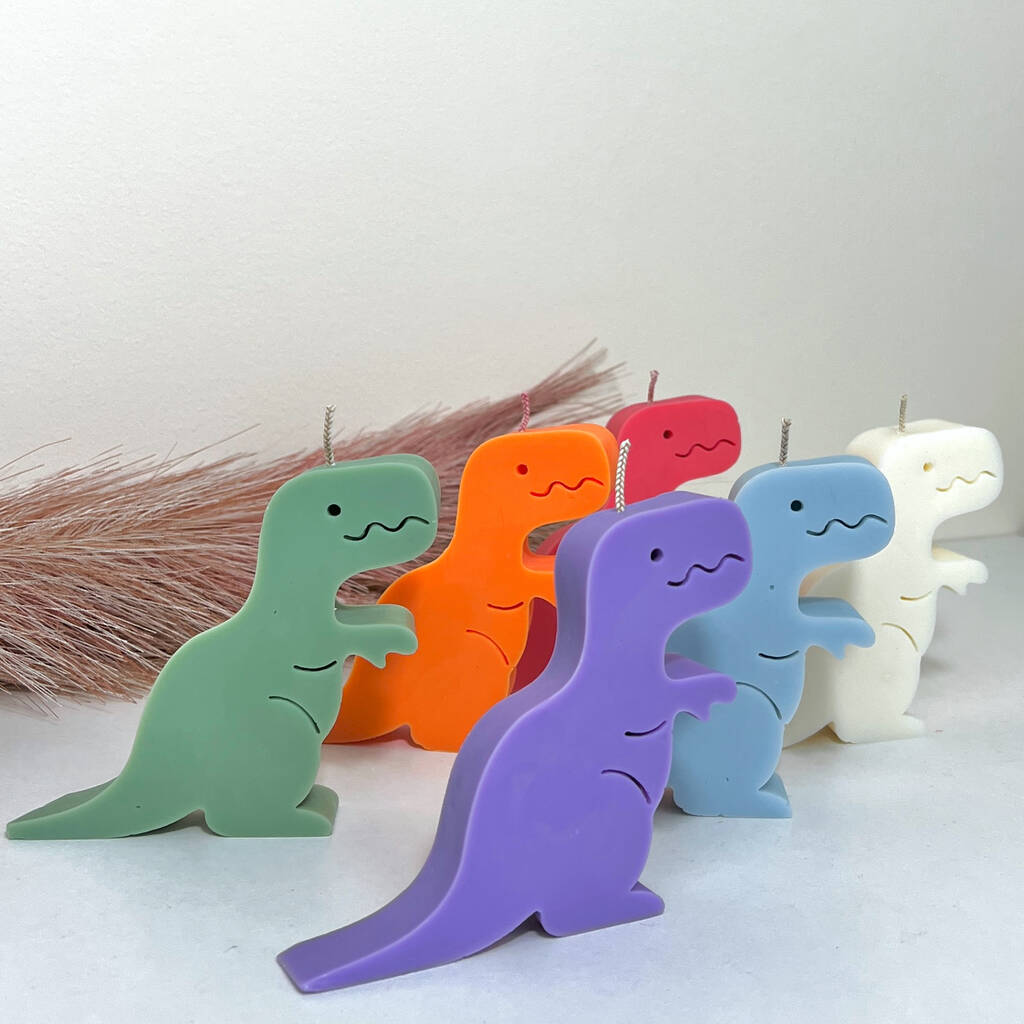 T. Rex dinosaur candle in pastel colours. These dinosaur gift candles are made in a fearsome Tyrannosaurus Rex design and are made from all natural soy wax.