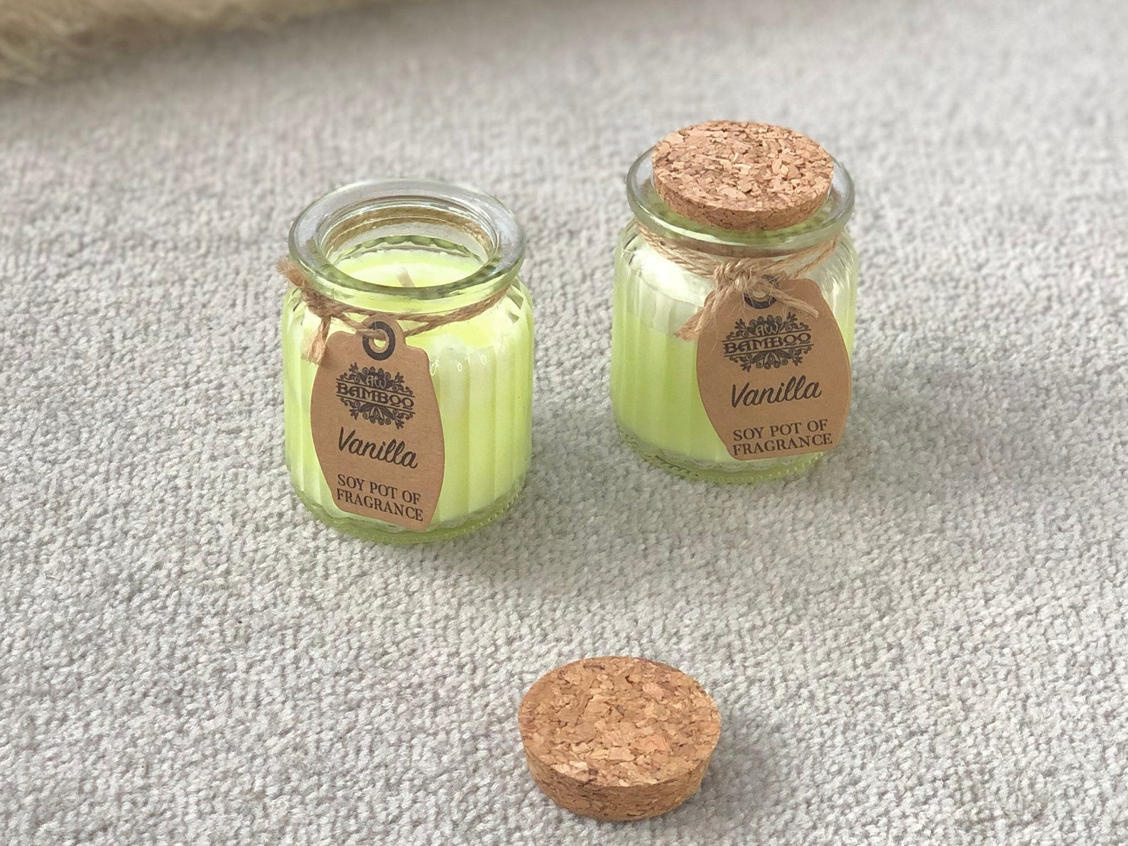 Eco friendly vegan vanilla scented soy wax candles in rustic glass fragrance pots with natural cork lids. The candles have a wonderful scent level and the vanilla scent is refreshing and perfect for this festive time of year, making your home feel warm and cosy. They make wonderful gifts and stocking fillers and are made from all natural soy wax which is much better for the environment and much cleaner to burn in your home. The glass pots look really beautiful too, especially when the candle is lit and the light dances across the curves of the glass.