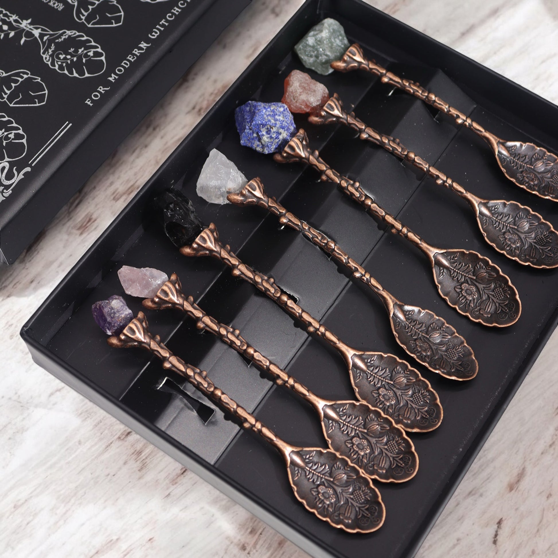 Add a touch of magic to your kitchen with our Victorian style crystal gemstone spoon set. This ornate collection includes 7 decorative metal spoons, each featuring a unique crystal: amethyst, rose quartz, black obsidian, rock quartz, lapis, red agate, and green aventurine.
