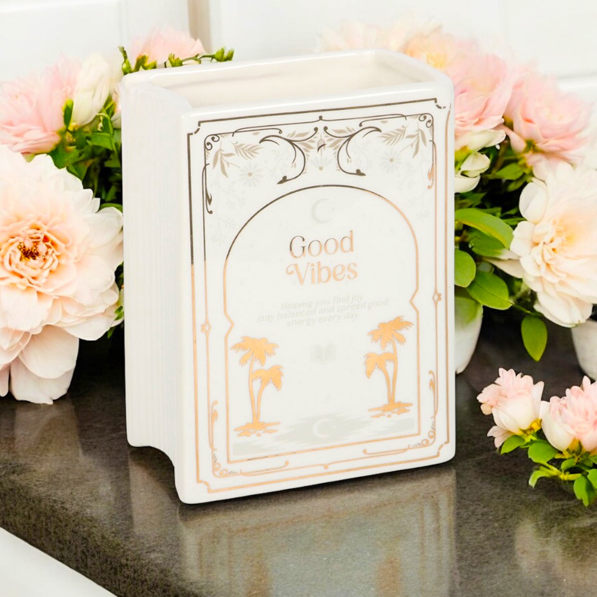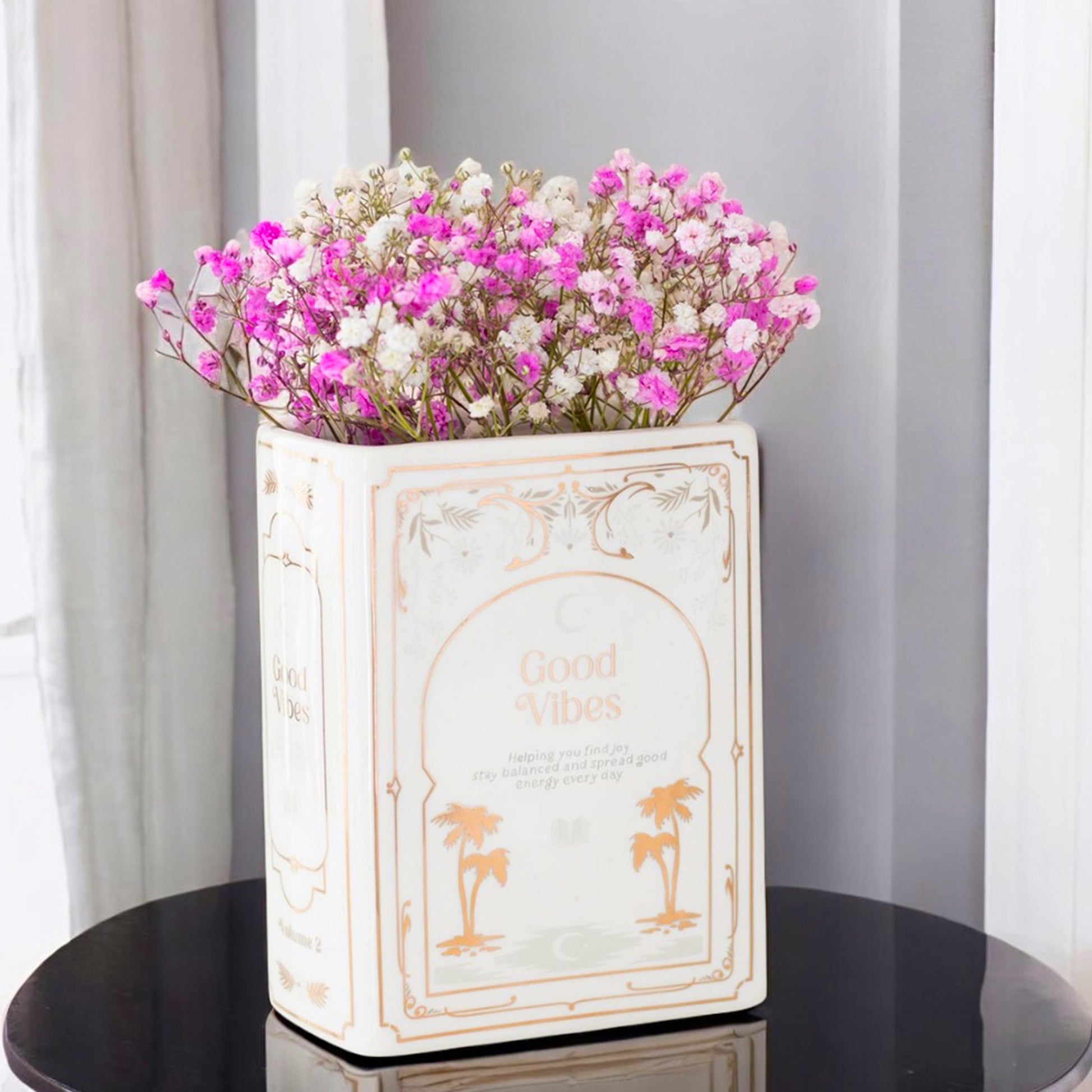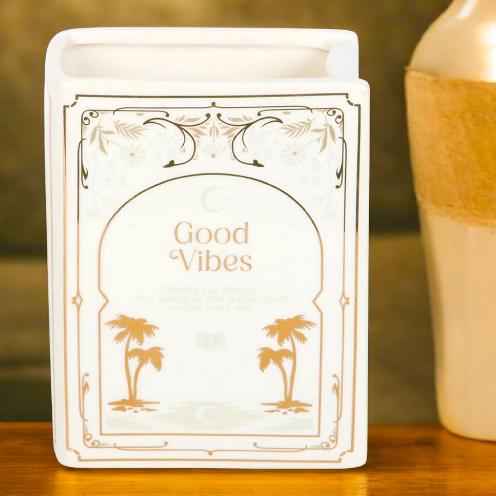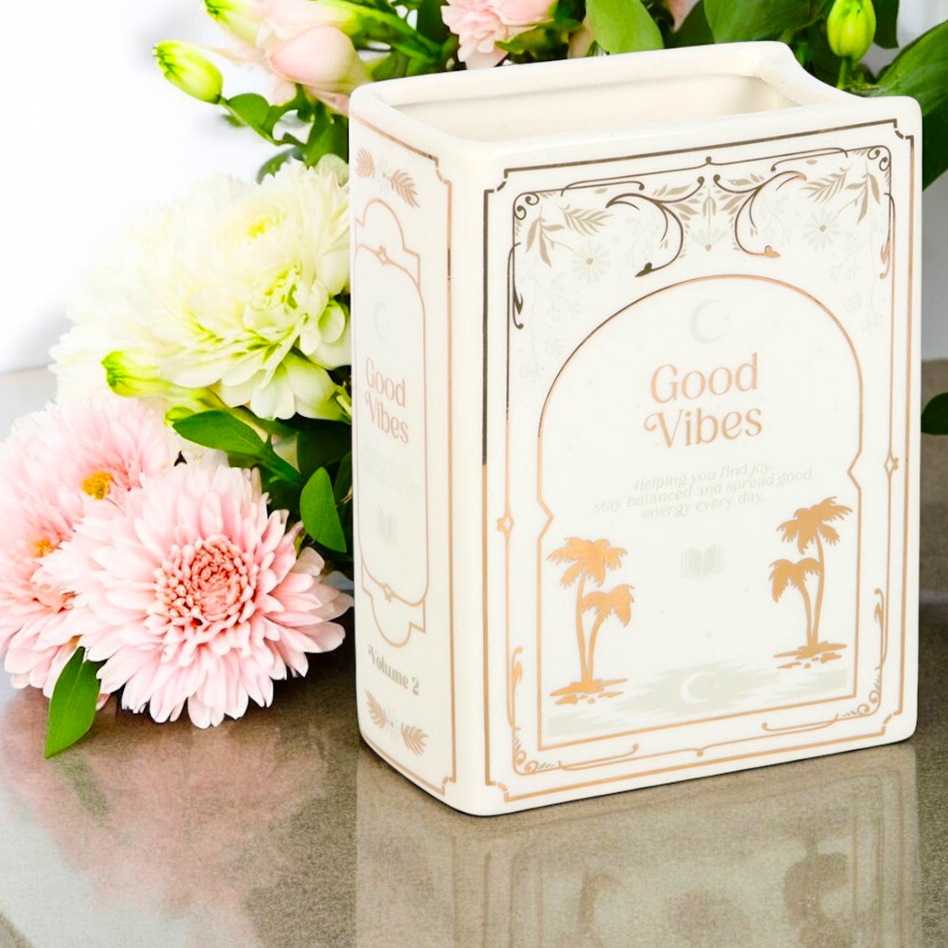 Our white ceramic book shaped vase has a book-inspired shape, and features gold palm trees, a crescent moon, and the uplifting phrase “Good Vibes”.