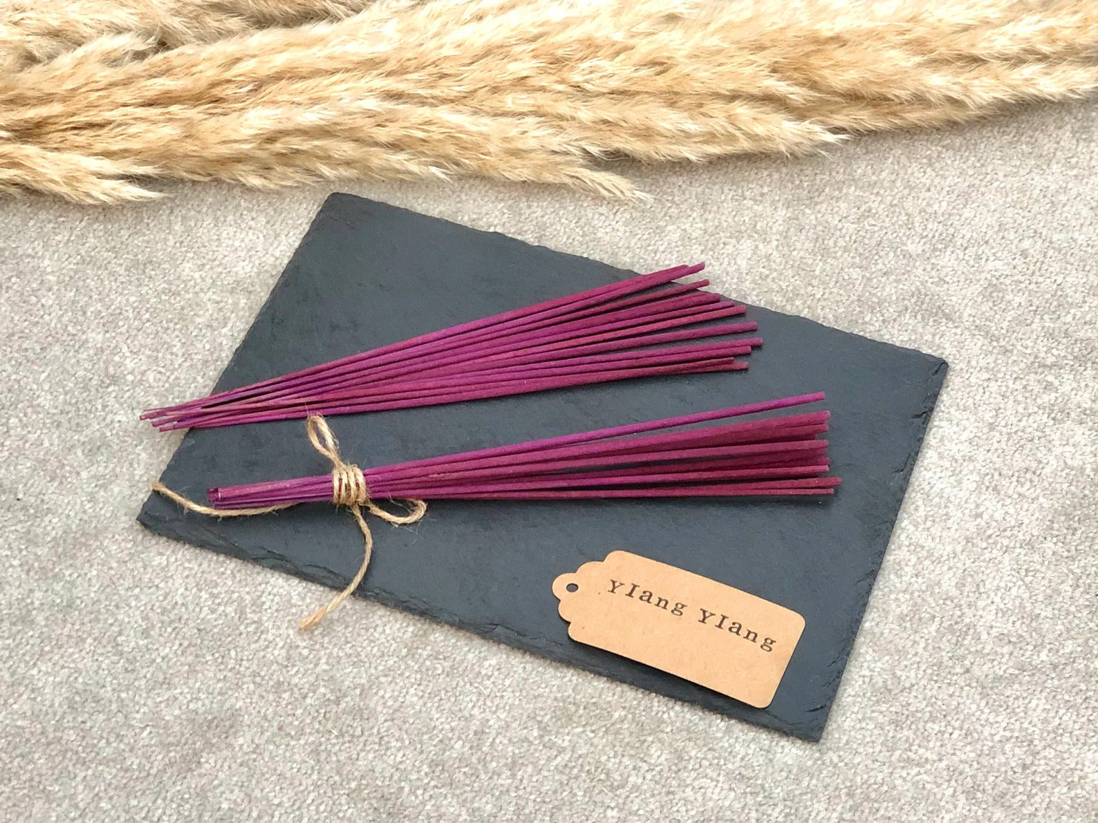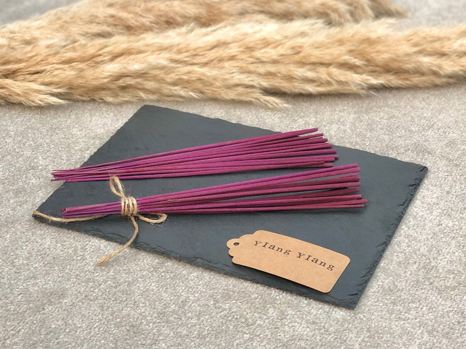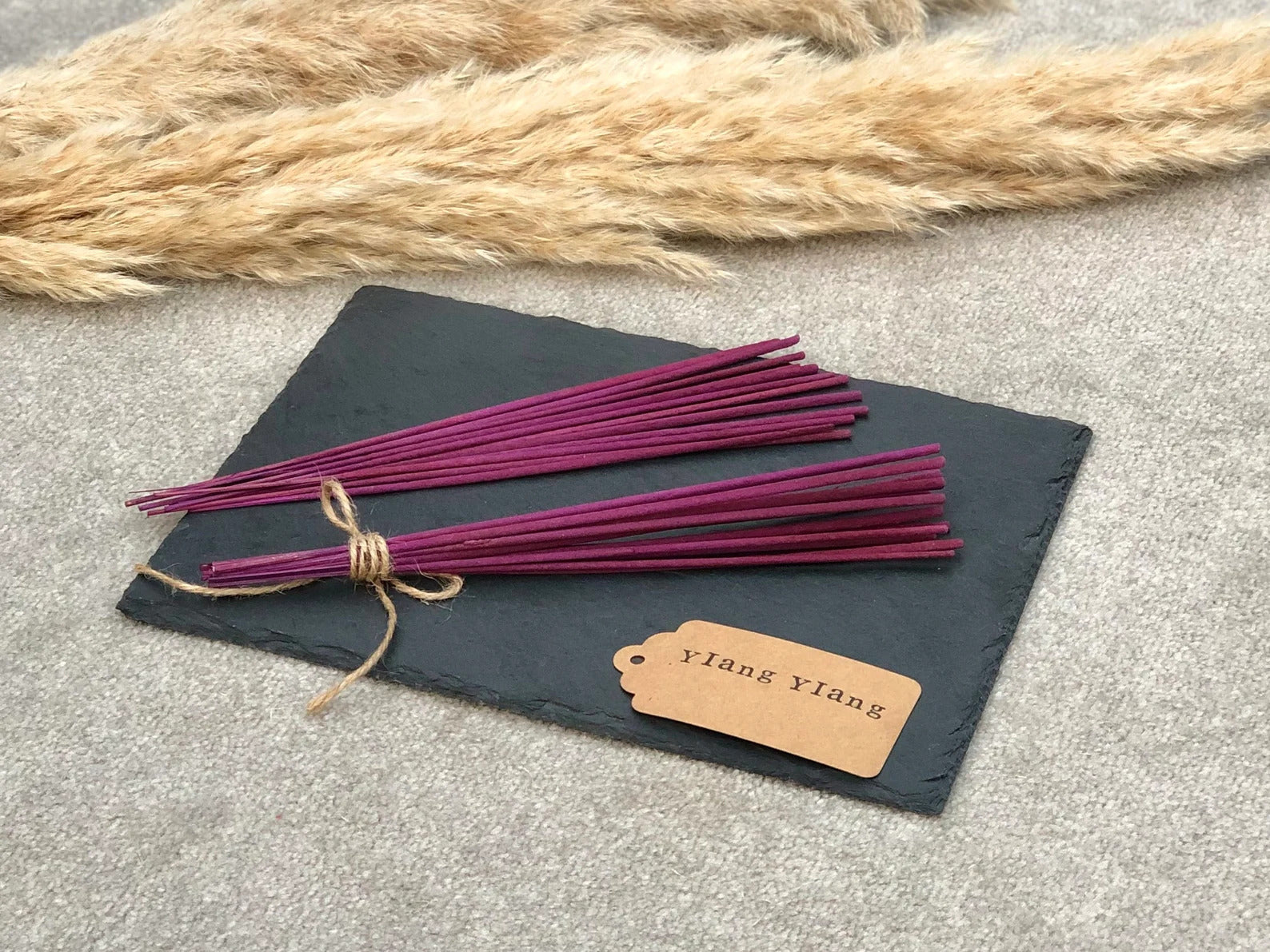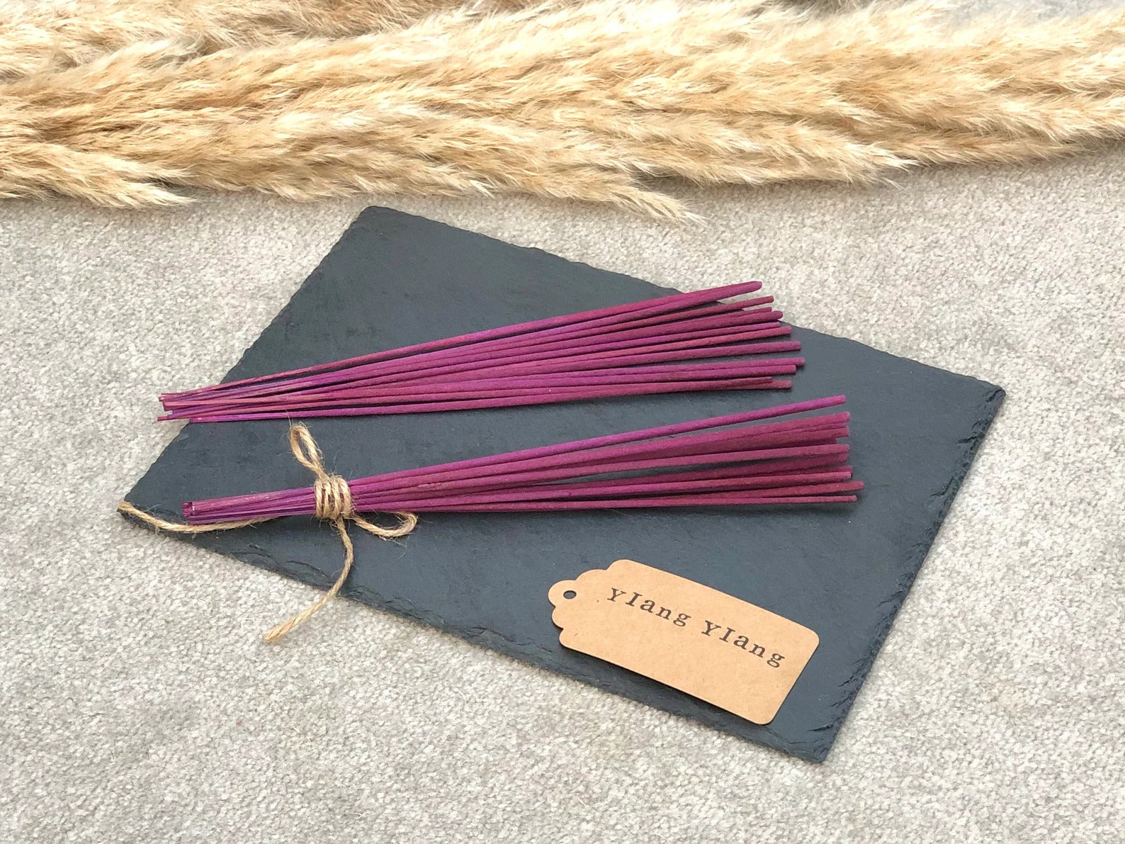 Natural ylang ylang incense sticks hand-rolled from organic bamboo, perfect for bringing a refreshing and pleasant scent to your home, also amazing incense sticks for using for yoga, meditation or prayer. These handmade incense sticks have the beautiful scent of ylang ylang which is a sweet essential oil which is made from the leaves of the tropical cananga tree which is native to parts of South and South East Asia in India, Malaysia and the Philippines. The incense has the most wonderful aroma and will leave you feeling totally calm and relaxed, bringing a calming atmosphere to your home. Each incense stick comes in a deep purple colour.
