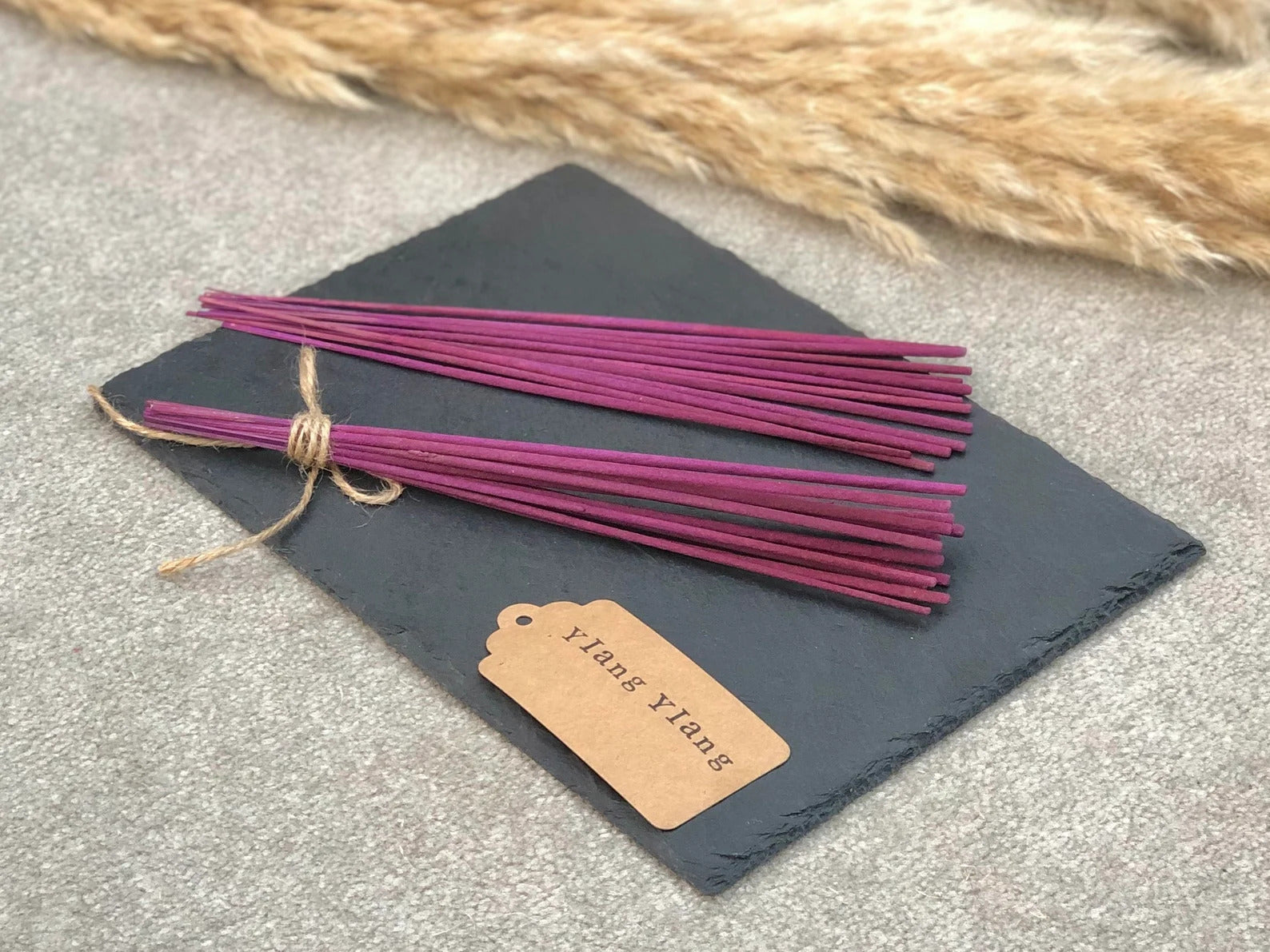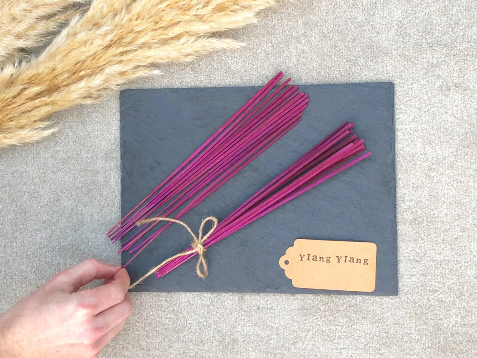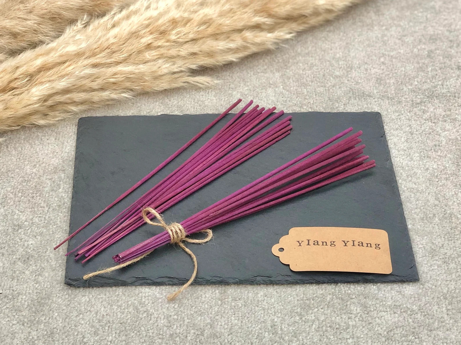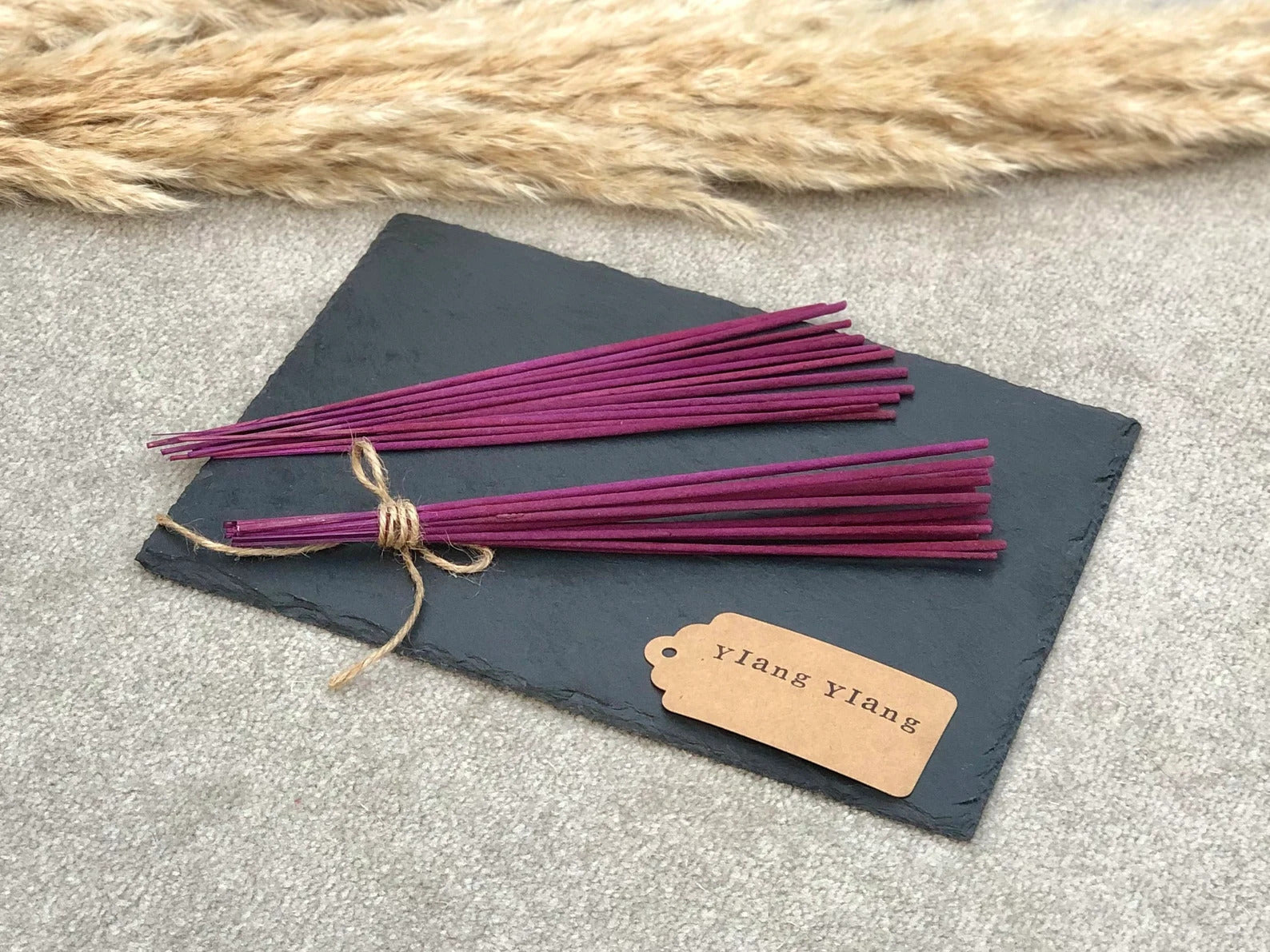 Natural ylang ylang incense sticks hand-rolled from organic bamboo, perfect for bringing a refreshing and pleasant scent to your home, also amazing incense sticks for using for yoga, meditation or prayer. These handmade incense sticks have the beautiful scent of ylang ylang which is a sweet essential oil which is made from the leaves of the tropical cananga tree which is native to parts of South and South East Asia in India, Malaysia and the Philippines. The incense has the most wonderful aroma and will leave you feeling totally calm and relaxed, bringing a calming atmosphere to your home. Each incense stick comes in a deep purple colour.